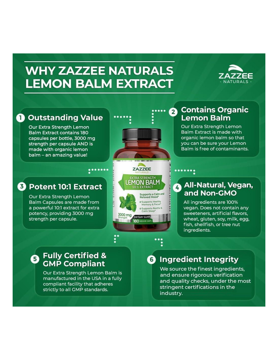 - MELISA ORGÁNICA: Cualquier Melisa que no sea orgánica puede estar contaminada y ser tóxica para tu cuerpo. Con el Extracto de Melisa Orgánica Zazzee Naturals, puedes estar seguro de que tu Melisa es orgánica, todo natural, vegana y no transgénica.
