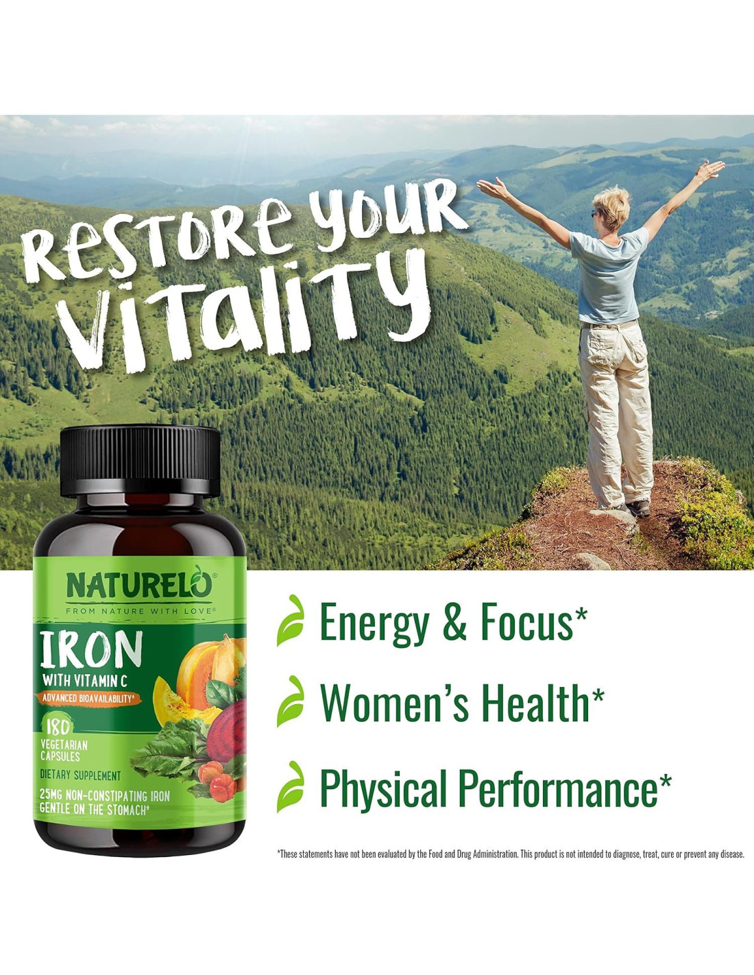 - SUPLEMENTO DE HIERRO VEGANO SUAVE: 25 mg de Hierro con Vitamina C de Cerezos Acerola Orgánicos y Mezcla de Alimentos Integrales Ricos en Hierro que incluye Remolacha Orgánica, Espinaca, Col Rizada, Acelga Suiza y Semilla de Calabaza. Aumenta la energía y disminuye la fatiga sin náuseas ni estreñimiento.