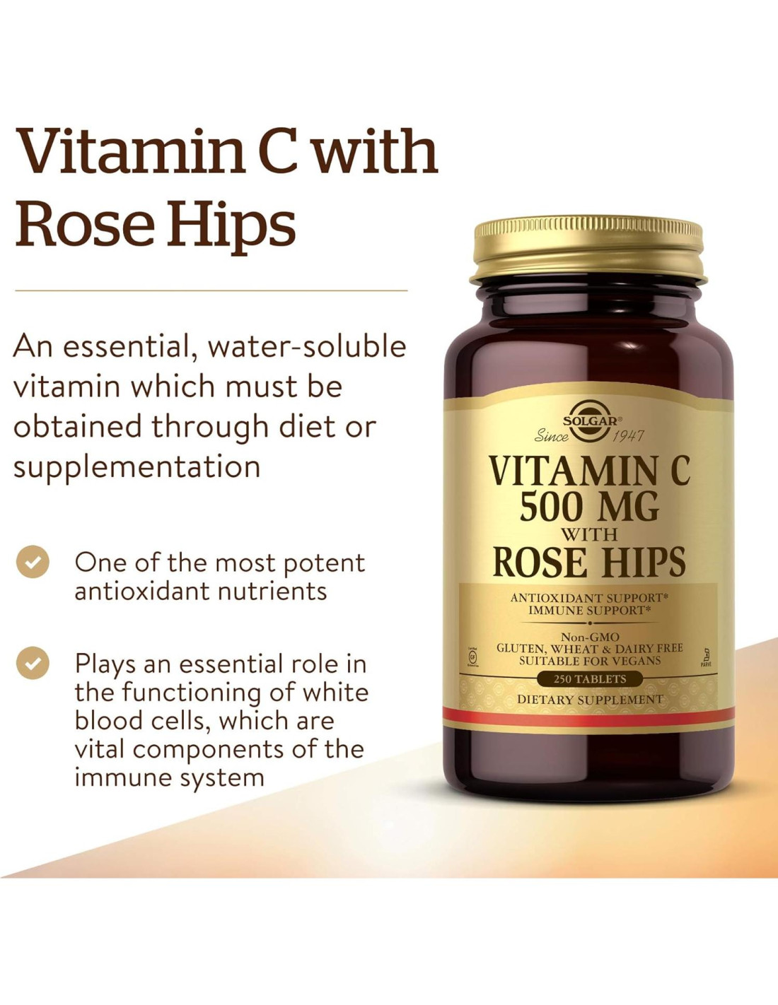 - No OGM y Sin Gluten; Las Tabletas de Vitamina C 500 mg de Solgar con Rosa Mosqueta son adecuadas para veganos; Libre de: gluten, trigo, lácteos, soja, levadura, azúcar, sodio, sabor y edulcorante artificial