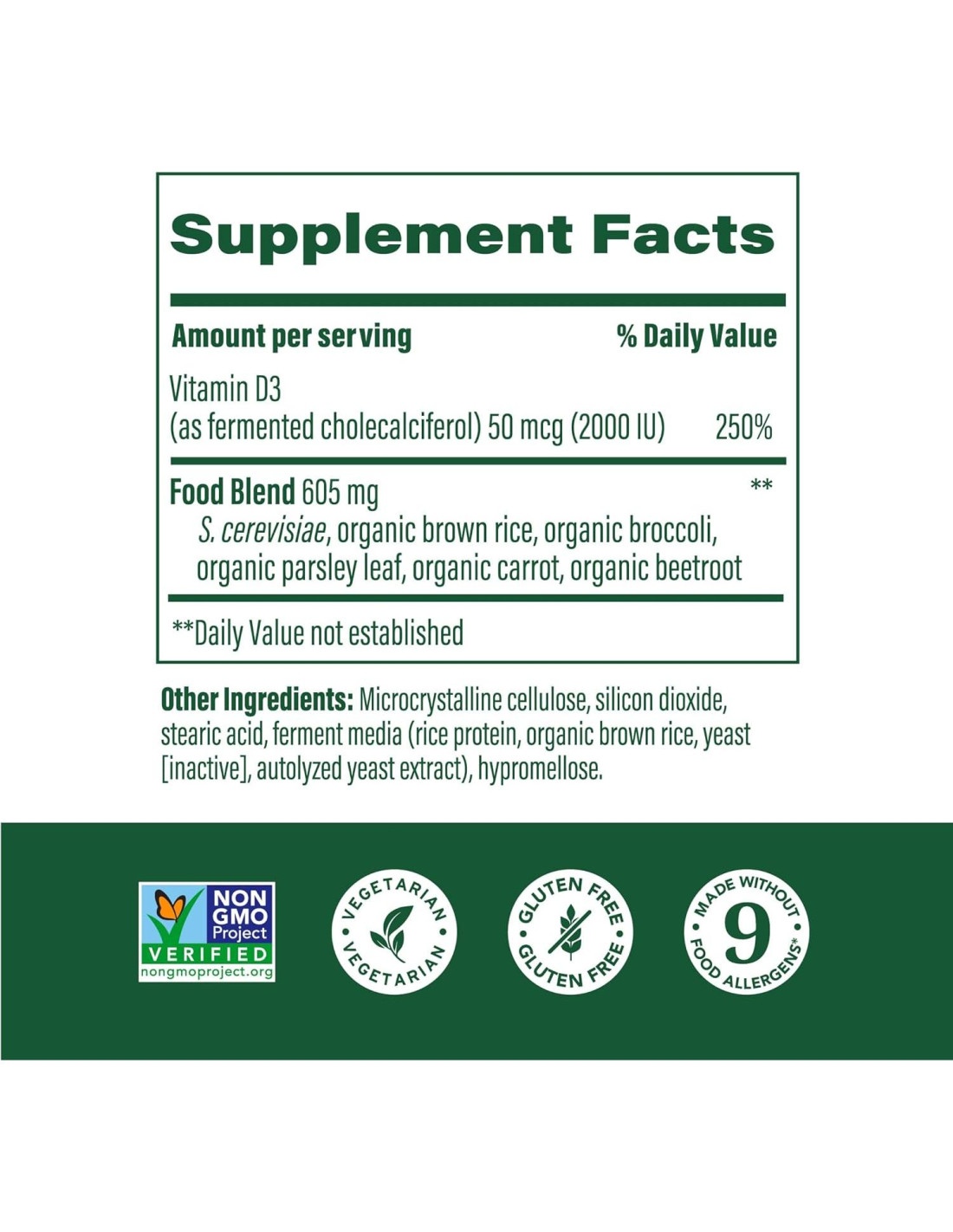 - ALTOS ESTÁNDARES SON SEGUNDA NATURALEZA: Este suplemento de Vitamina D 2000 UI es libre de gluten, vegetariano, sin OGM, Kosher, probado para 150 sustancias químicas y elaborado sin nueve alérgenos alimentarios: leche, huevos, cacahuetes, nueces, soja, trigo, pescado, mariscos y sésamo