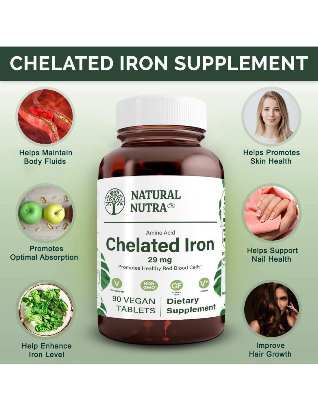 - AYUDA A PROMOVER LA SALUD DEL CABELLO, PIEL Y UÑAS- Como componente de la hemoglobina, el hierro es necesario para transportar oxígeno por todo el cuerpo. Nuestros suplementos minerales de hierro quelado son más fácilmente y efectivamente absorbidos por el cuerpo. Nuestro suplemento de hierro quelado también mejora la salud del cabello, piel y uñas al mantener los niveles de hierro.
