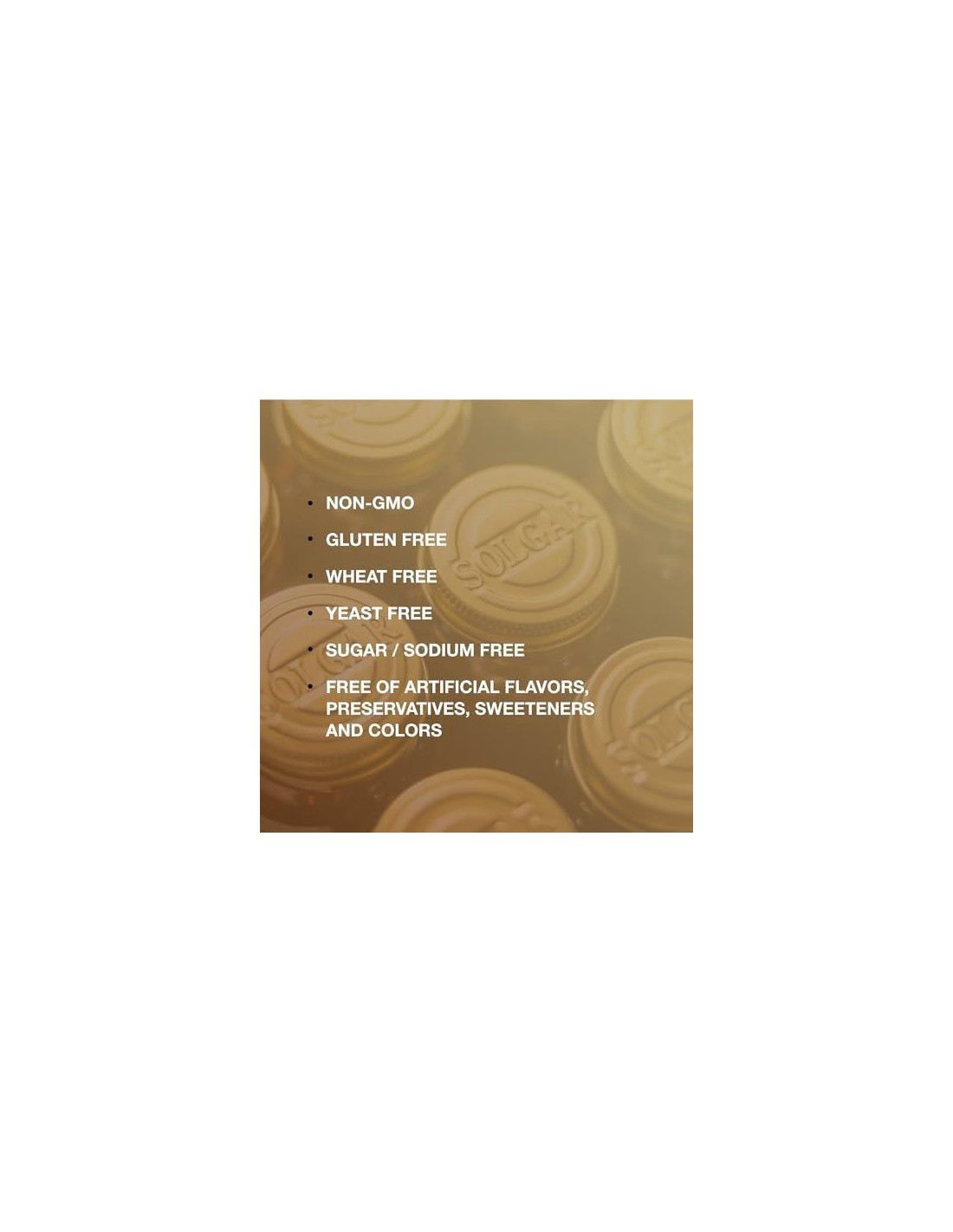 - El Estándar de Oro; Durante más de 75 años, Solgar se ha comprometido con la calidad, la salud y el bienestar. Nuestra misión es crear los mejores suplementos nutricionales en pequeñas cantidades, a través de una investigación incansable, utilizando solo las mejores materias primas.