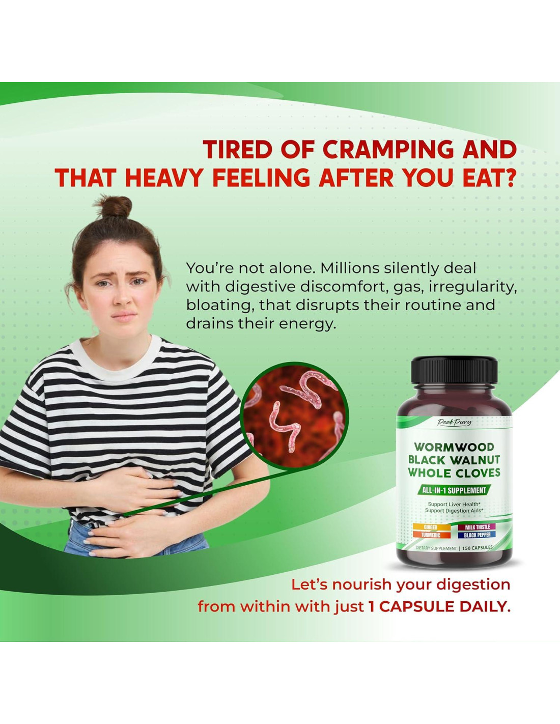 Suplemento de Ajenjo, Nogal Negro, Clavos de Olor y Jengibre - Apoya la Salud del Hígado y Ayuda a la Digestión - Hecho en EE. UU. - 150 Cápsulas