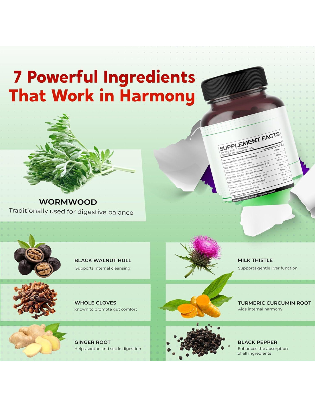 - Fórmula Integral: Nuestro suplemento todo en uno combina poderosos ingredientes naturales como Ajenjo, Cáscara de Nogal Negro, Clavos de Olor y más en una sola cápsula conveniente