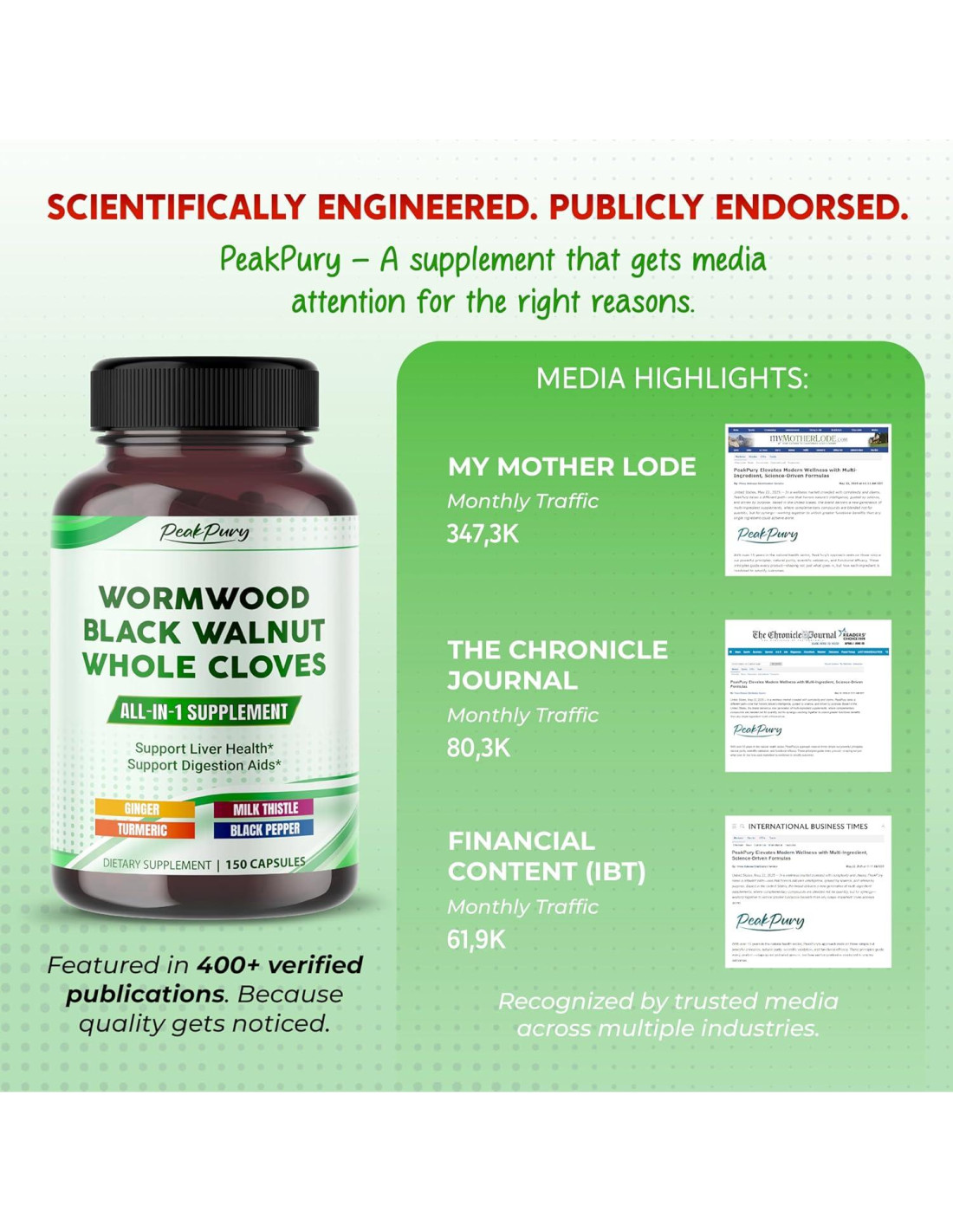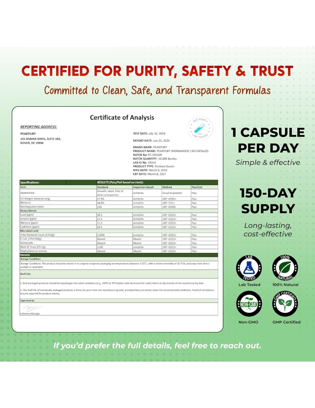 - Maximiza el Valor con Más Cápsulas: Desbloquea un valor excepcional con el suplemento premium de Ajenjo de PeakPury, que ofrece 150 cápsulas por botella, proporcionando un suministro de 5 meses para apoyar tu viaje de bienestar a largo plazo