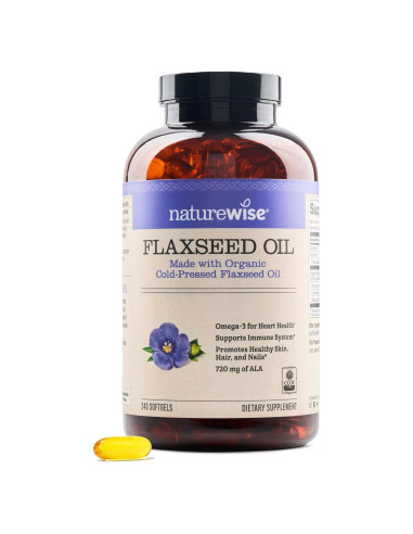 Los ácidos grasos esenciales omega-3 son una parte importante de cualquier dieta saludable. Ayudan a mantener tu cerebro y corazón saludables y apoyan una respuesta inflamatoria e inmune saludable. La mayoría de los suplementos de omega-3 son suplementos de aceite de pescado, pero muchas personas tienen preocupaciones sobre las toxinas ambientales y el contenido de mercurio que a menudo se encuentra en el pescado, así como la sostenibilidad y la ética de la pesca. Por eso NatureWise proporcionó una solución más ecológica para la suplementación de omega-3. El Aceite de Semilla de Lino de NatureWise es una rica fuente vegetal de ácidos grasos omega-3 esenciales, junto con omega-6 esenciales y omega-9 no esenciales. Estos ácidos grasos también nutren tu cabello, piel y uñas. Cada porción está estandarizada para proporcionar 720 mg de ALA, o ácido alfa-linolénico, un ácido graso omega-3 que el cuerpo convierte en EPA y DHA, los mismos omega-3 que se encuentran comúnmente en los aceites de pescado. Certificado orgánico y no modificado genéticamente, este suplemento de aceite de semilla de lino es una alternativa limpia a los suplementos de aceite de pescado. El Aceite de Semilla de Lino de NatureWise es prensado en frío y sin refinar para mantener los beneficios de las semillas de lino sin el uso de calor, hexano o químicos.