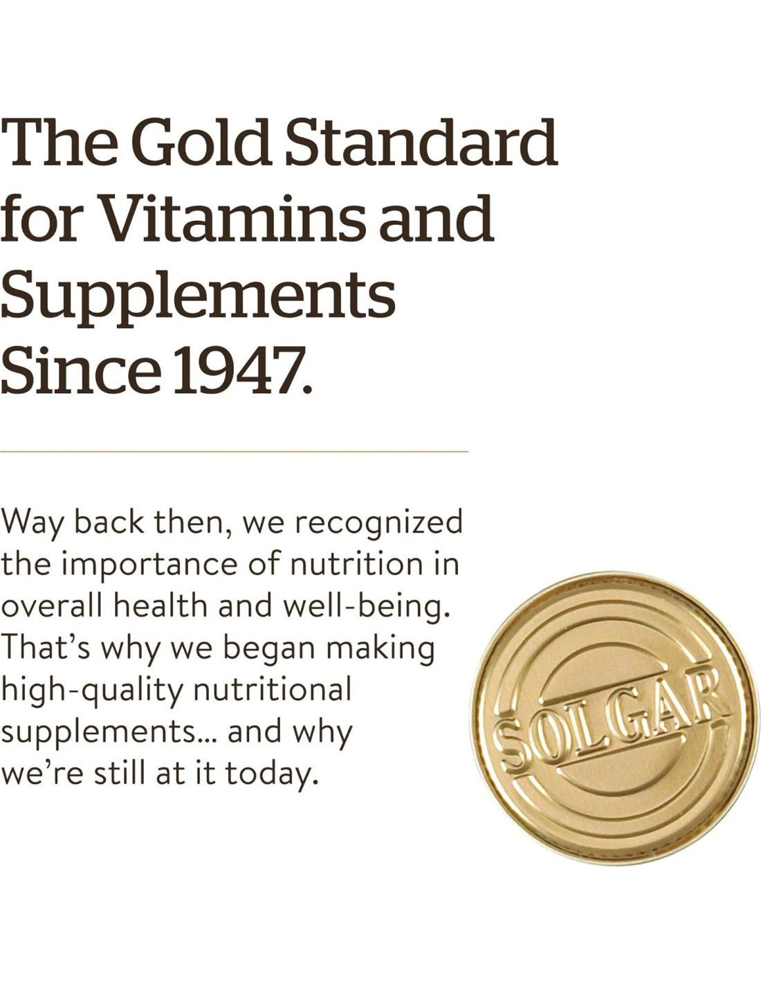 - El Estándar de Oro: Durante más de 70 años, Solgar se ha comprometido con la calidad, la salud y el bienestar. Nuestra misión es crear los mejores suplementos nutricionales en pequeñas cantidades, a través de una investigación incansable, utilizando solo las mejores materias primas