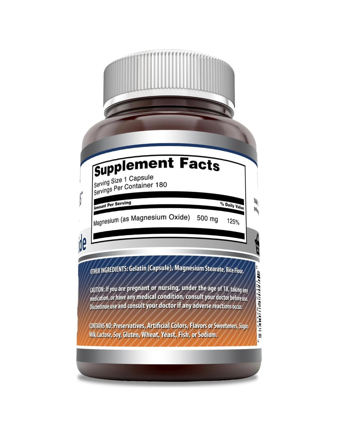 Suplemento de Óxido de Magnesio 500 Mg Por Porción 1 Cápsula Por Porción, 180 Porciones Por Botella No OGM, Sin Gluten, Probado por Terceros Fabricado de acuerdo con los Estándares GMP Orgullosamente hecho en EE. UU. con Pureza y Potencia Garantizadas