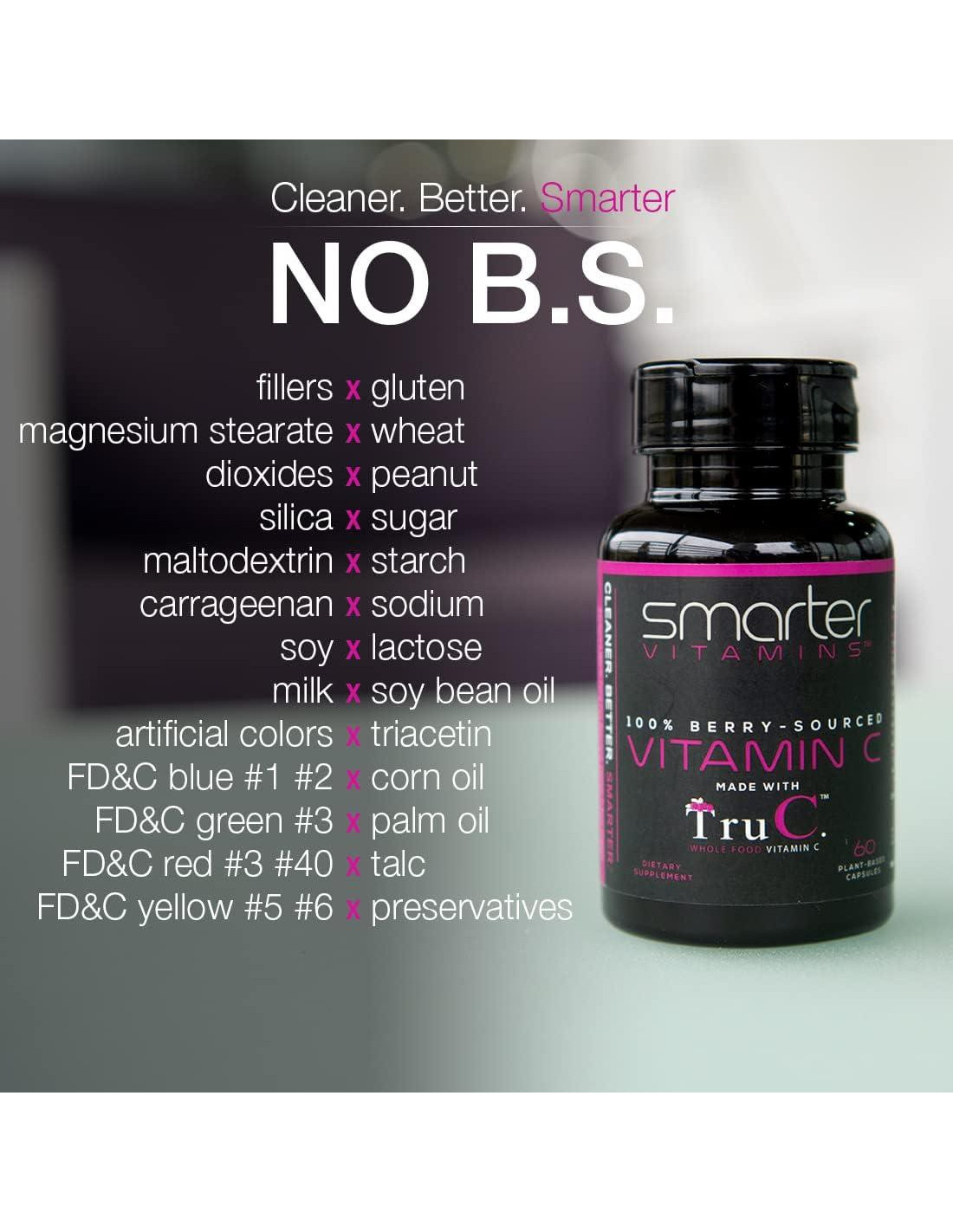 Cápsulas de Vitamina C Smarter hechas con TruC, utilizando 11 bayas diferentes para aprovechar los antioxidantes naturales. TruC está hecho solo con los mejores ingredientes no modificados genéticamente y está libre de colores, sabores y conservantes artificiales. Un espectro completo de, incluyendo