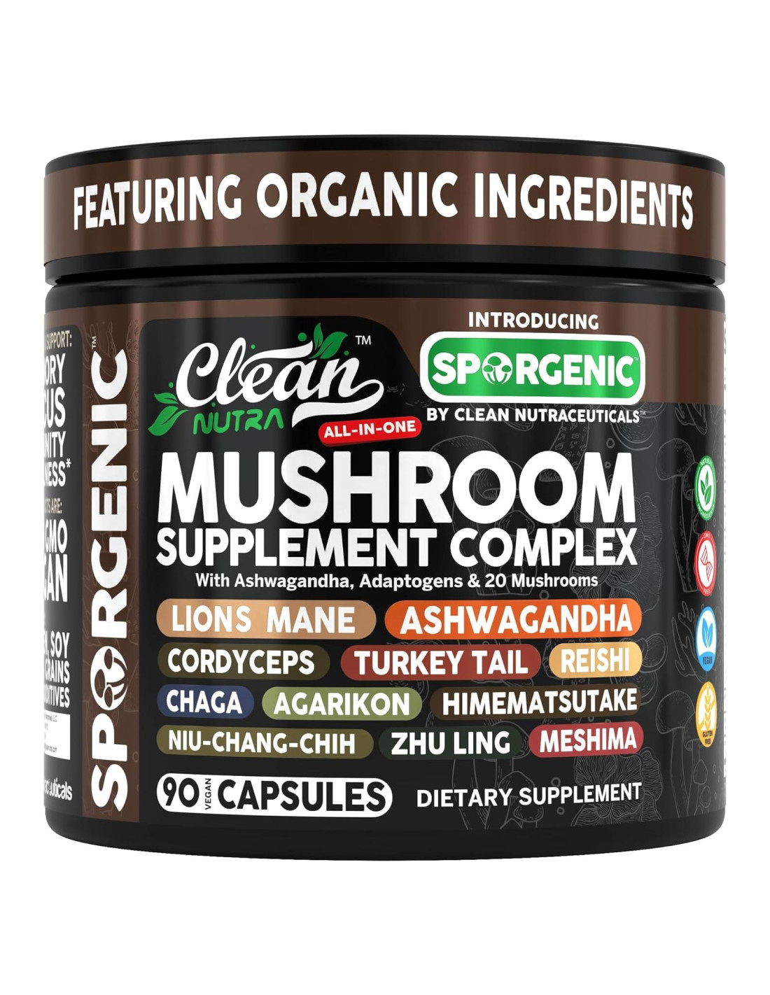 Presentamos el suplemento de champiñones Sporgenic de Clean Nutra, un revolucionario suplemento todo en uno diseñado para apoyar tu viaje de bienestar. Meticulosamente formulado, una fusión de la mezcla más potente de la naturaleza de ashwagandha ksm 66, tintura de cola de pavo, extracto de champiñón shiitake, extracto de champiñón chaga, extracto de tremella, agarikon y suplemento de ostra para mujeres para nutrir tu cuerpo. Estos ingredientes ayudan con la salud inmunológica, vitalidad, fácil absorción y apoyo a la mucosa intestinal. Complementando esto, el polvo de cola de pavo, el polvo de raíz de ashwagandha orgánica y el suplemento de champiñón shiitake son celebrados por sus beneficios para la salud inmunológica y el apoyo a la digestión, mientras que el polvo de reishi y el agarikon cola de pavo proporcionan resistencia y vitalidad. Nuestro suplemento de champiñones está diseñado para apoyar tus objetivos de salud, ya sea que busques un suplemento de apoyo inmunológico, un aid digestivo o apoyo general. Experimenta los beneficios del suplemento de polvo de champiñones orgánicos Sporgenic con solo 3 cápsulas al día que reúnen lo mejor de la melena de león orgánica, champiñón reishi, champiñones shiitake secos, champiñones tremella y más.