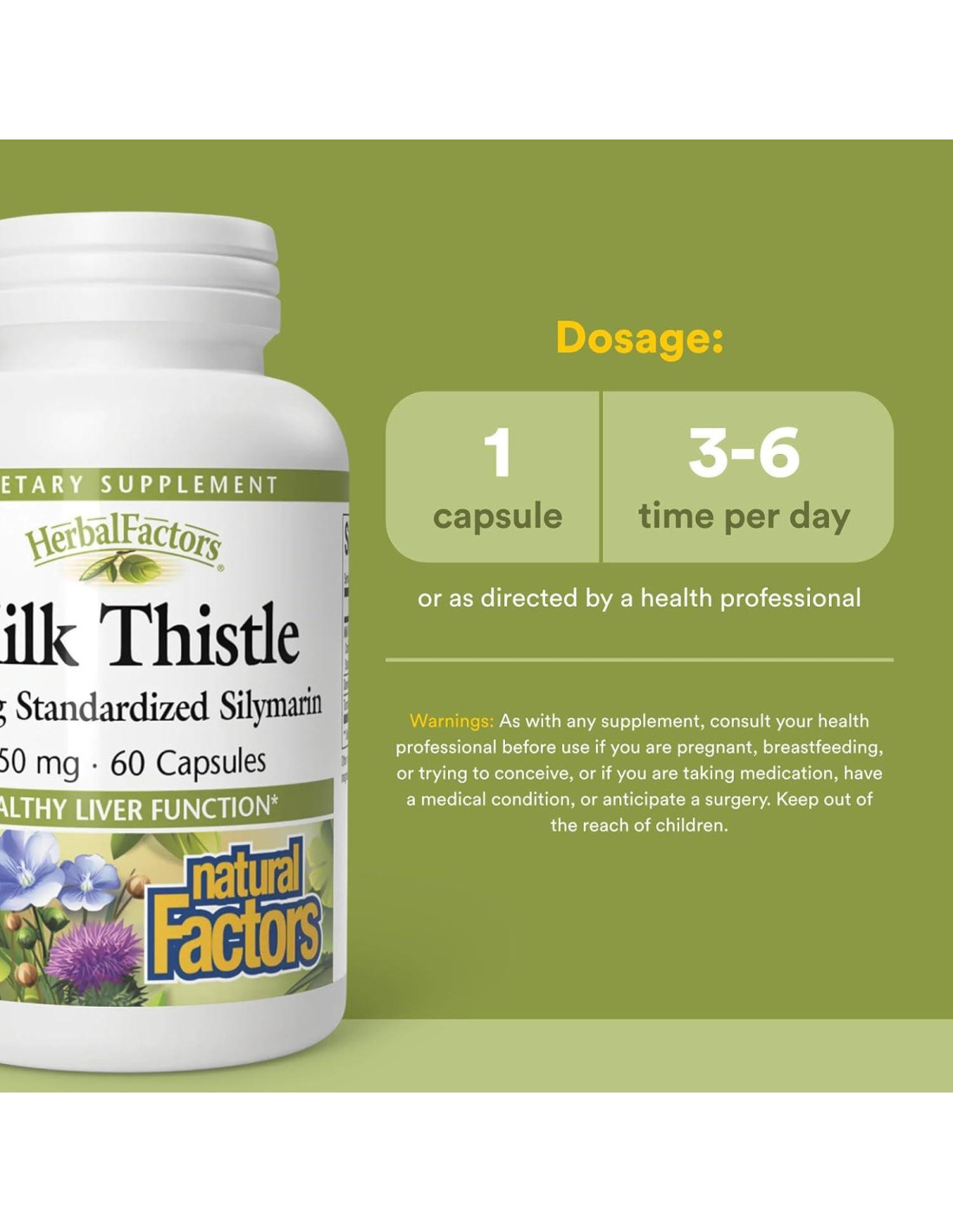 El Cardo Mariano (Silybum marianum) se ha utilizado durante miles de años como un aid digestivo, pero es más conocido como una hierba superior para apoyar el hígado y la vesícula biliar. Los ingredientes activos en el cardo mariano son flavonoides compuestos de silibina, silidianina y silichristina - colectivamente conocidos como silimarina, y el Cardo Mariano de Factores Naturales está estandarizado al 80% de silimarina. El Extracto de Cardo Mariano apoya al hígado para desintoxicar químicos y otras sustancias dañinas para el hígado y el cuerpo. Se añade la raíz de Diente de León y la raíz de Cúrcuma que también benefician las funciones hepáticas.