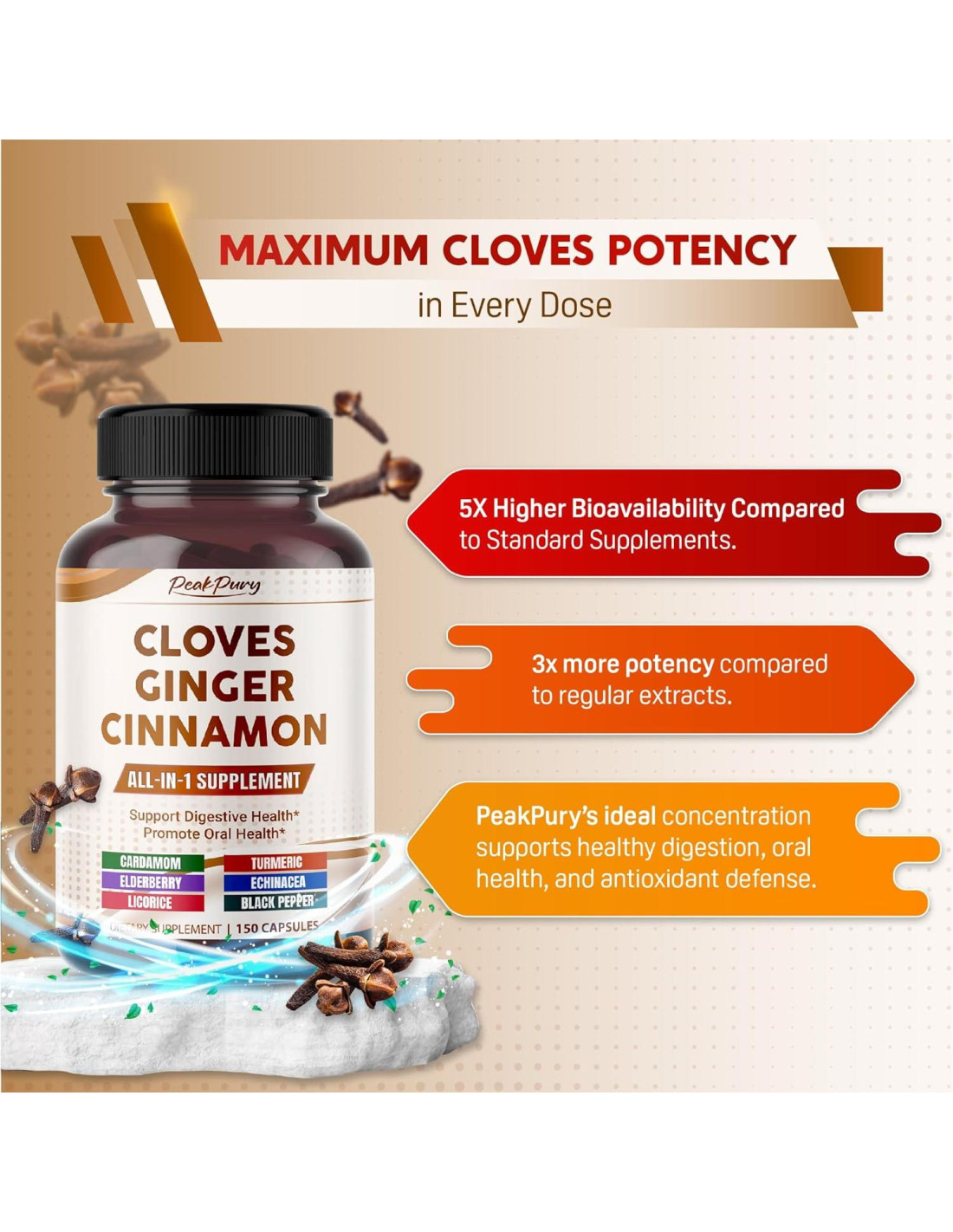 - Maximiza el Valor con Más Cápsulas: Desbloquea un valor excepcional con el suplemento premium de Clavos de PeakPury, que ofrece 150 cápsulas por botella, proporcionando un suministro de 5 meses para apoyar tu viaje de bienestar a largo plazo