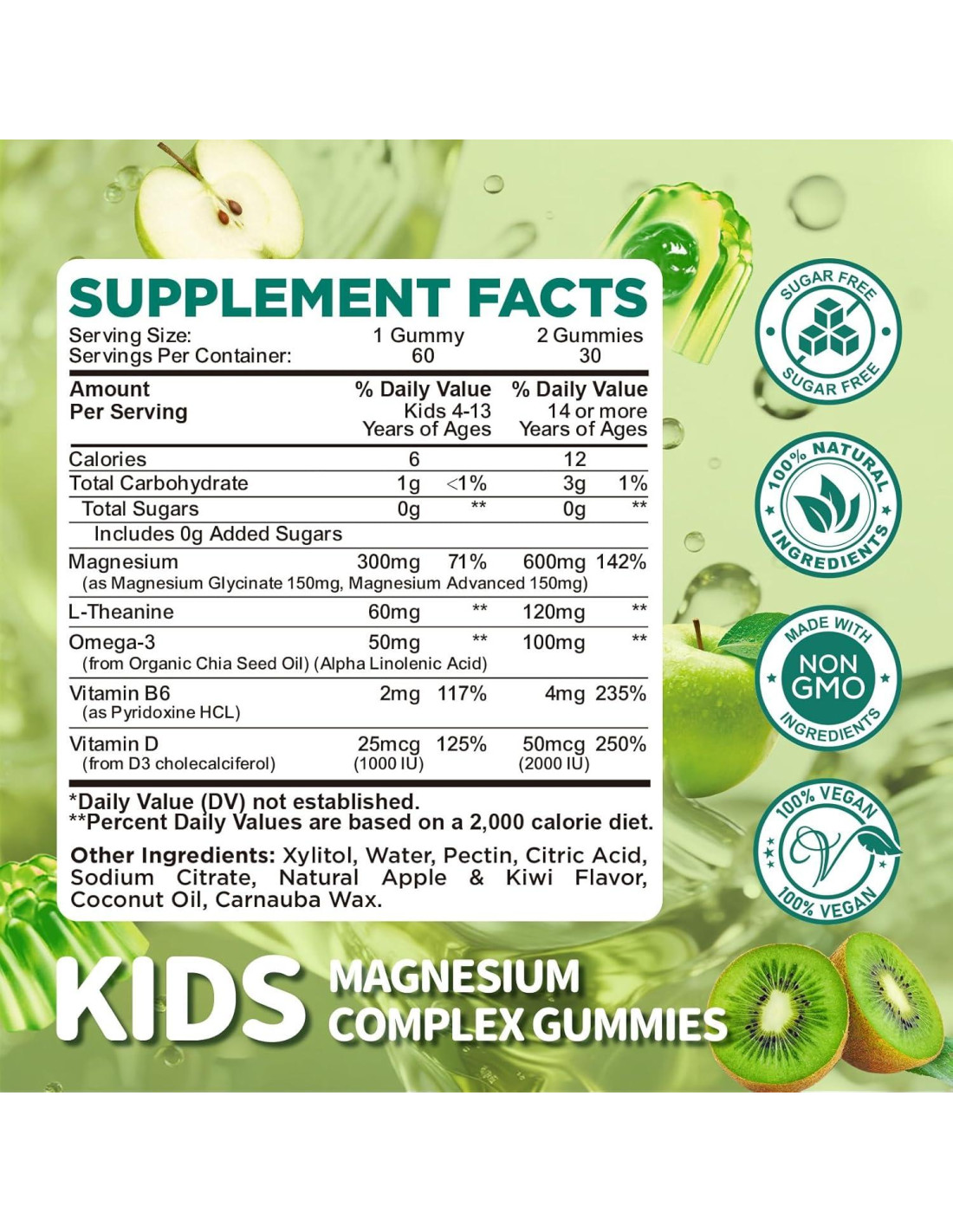 - Gomitas de Magnesio Calmantes: Nuestras gomitas de magnesio para niños contienen 6 ingredientes suaves, incluyendo Glicinato de Magnesio, L-teanina, Omega-3, Vitamina B6 y D3, las gomitas de glicinato de magnesio para niños ayudan a promover un sueño reparador, calma, energía, relajación, apoyo al ánimo, huesos y músculos para su pequeño, proporcionando una base física para su felicidad y actividad.