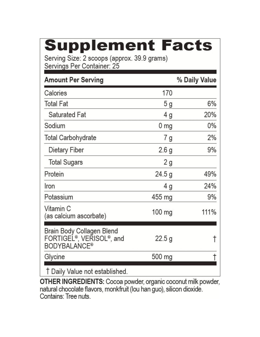 - Nuestros Suplementos de Colágeno Brain Body son proteínas premium, fácilmente absorbidas, derivadas de huesos, cartílago y piel de animales. Presentando una mezcla única de péptidos de colágeno patentados Verisol, Fortigel y BodyBalance, esta fórmula apoya naturalmente una piel, articulaciones, músculos, cabello y uñas más saludables. ¡Disfruta de su delicioso sabor a coco vainilla cremosa a diario!
