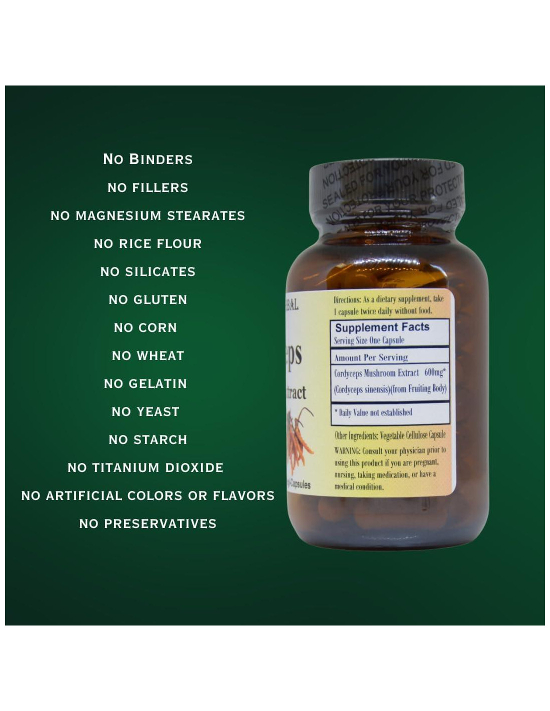 Extracto de Hongo Cordyceps 10:1, del Cuerpo Frutal- Cápsulas de 60-600mg de Barlowe's Herbal Elixirs - La Elevación de la Resistencia y Vitalidad - Viaja a las alturas del Himalaya con Cordyceps, un hongo venerado tradicionalmente por sus propiedades energizantes y restauradoras. Con las cápsulas de Extracto de Hongo Cordyceps de Barlowe, desbloquea un reservorio de resistencia y vitalidad natural, resonando con la sabiduría de tradiciones antiguas. Cordyceps ha sido un pilar en las prácticas de bienestar tibetanas y chinas por su potencial para invigorizar y aumentar la resistencia. Experimenta la verdadera potencia de Cordyceps, meticulosamente capturada en cada cápsula para tu viaje de bienestar. Nuestras botellas de vidrio de firma mantienen la frescura máxima y reflejan nuestro compromiso inquebrantable con el planeta. Pruebas exhaustivas de terceros para identidad y pureza garantizan una calidad inigualable. Manteniendo en mente las necesidades dietéticas globales, nuestras cápsulas de Extracto de Hongo Cordyceps no contienen estearatos, gluten, maíz, trigo, arroz o levadura. Abraza el Cordyceps de Barlowe's Herbal Elixirs y asciende a nuevas cumbres de salud holística y vitalidad sin límites.