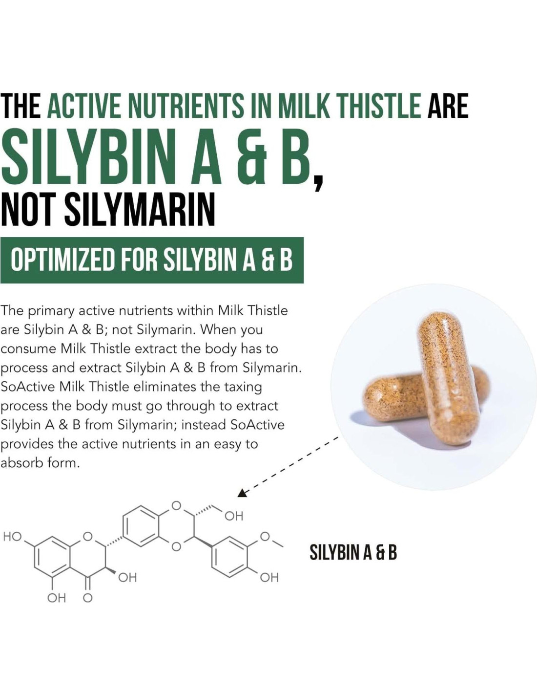 - OPTIMIZADO PARA NUTRIENTES ESENCIALES DEL CARDOMARIANO SILYBIN A & B, NO SILYMARIN: Los nutrientes dentro del Cardo Mariano que le dan beneficio son Silybin A & B, no Silymarin. Cuando consumes Silymarin en otros productos de Cardo Mariano, el cuerpo debe extraer la Silybin del Silymarin.