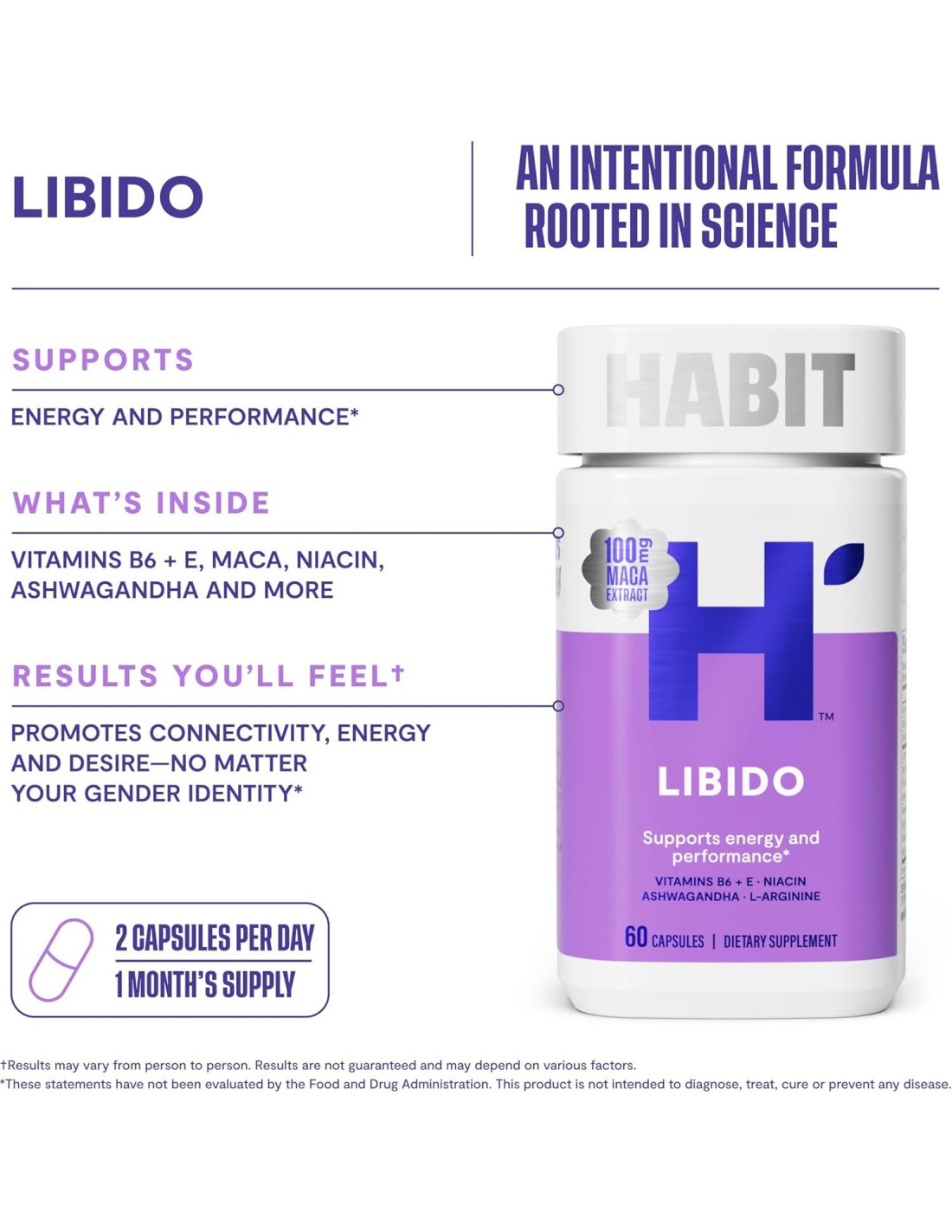 - ACTIVA TU IMPULSO: Siéntete más vivo. La Libido de HABIT ayuda a apoyar la energía y un apetito por la intimidad con nutrientes respaldados por la ciencia más una mezcla natural de afrodisíacos*.