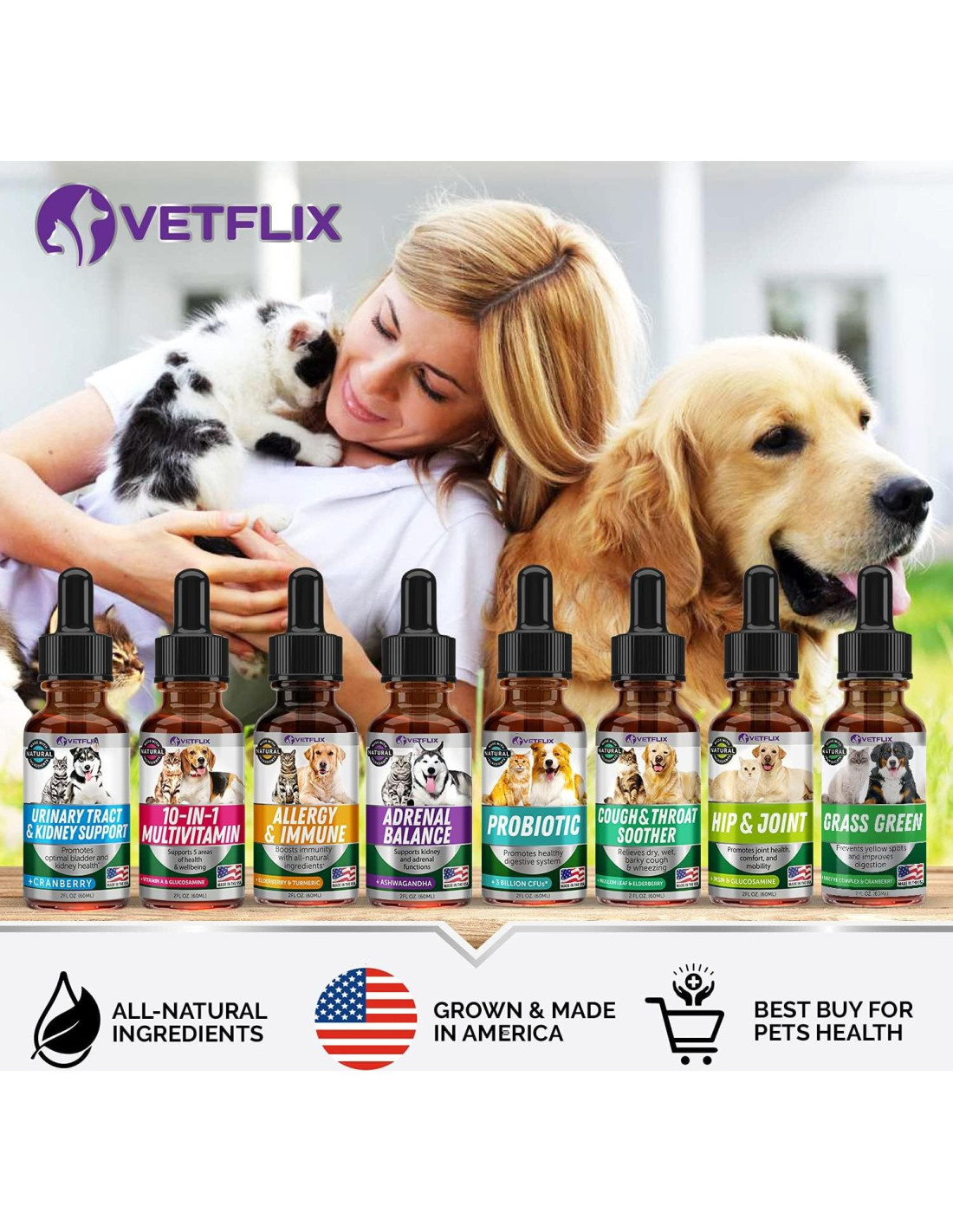 - Fórmula 10 en 1 - Las gotas de vitaminas para mascotas Vetflix son un buen suplemento con ingredientes premium y multivitaminas. Apoya fácilmente el rendimiento físico, la salud de caderas y articulaciones, corazón, sistema inmunológico, piel, hígado y salud intestinal para perros y gatos de todas las edades, razas y tamaños.