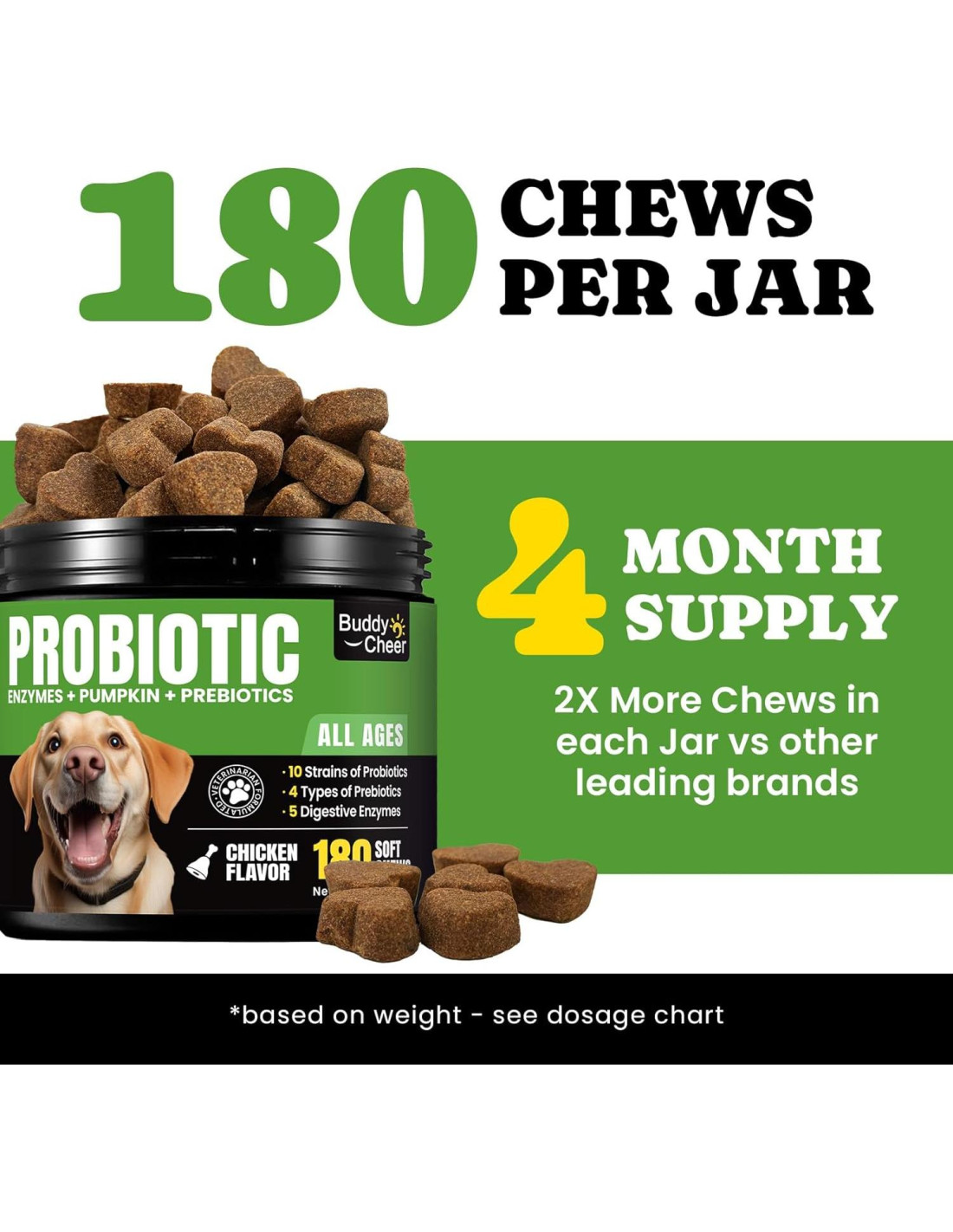 - Suministro Duradero y Garantía Los probióticos para perros vienen con 180 masticables-hasta 2 meses de soporte diario. Gran sabor y textura que incluso los perros más exigentes aman. Si tú o tu mascota no están completamente satisfechos con los resultados, estamos aquí para ayudarte. Cualquier problema con el producto, contáctanos a través del Centro de Mensajes de Amazon. Disfruta de un REEMBOLSO COMPLETO, SIN PREGUNTAS!