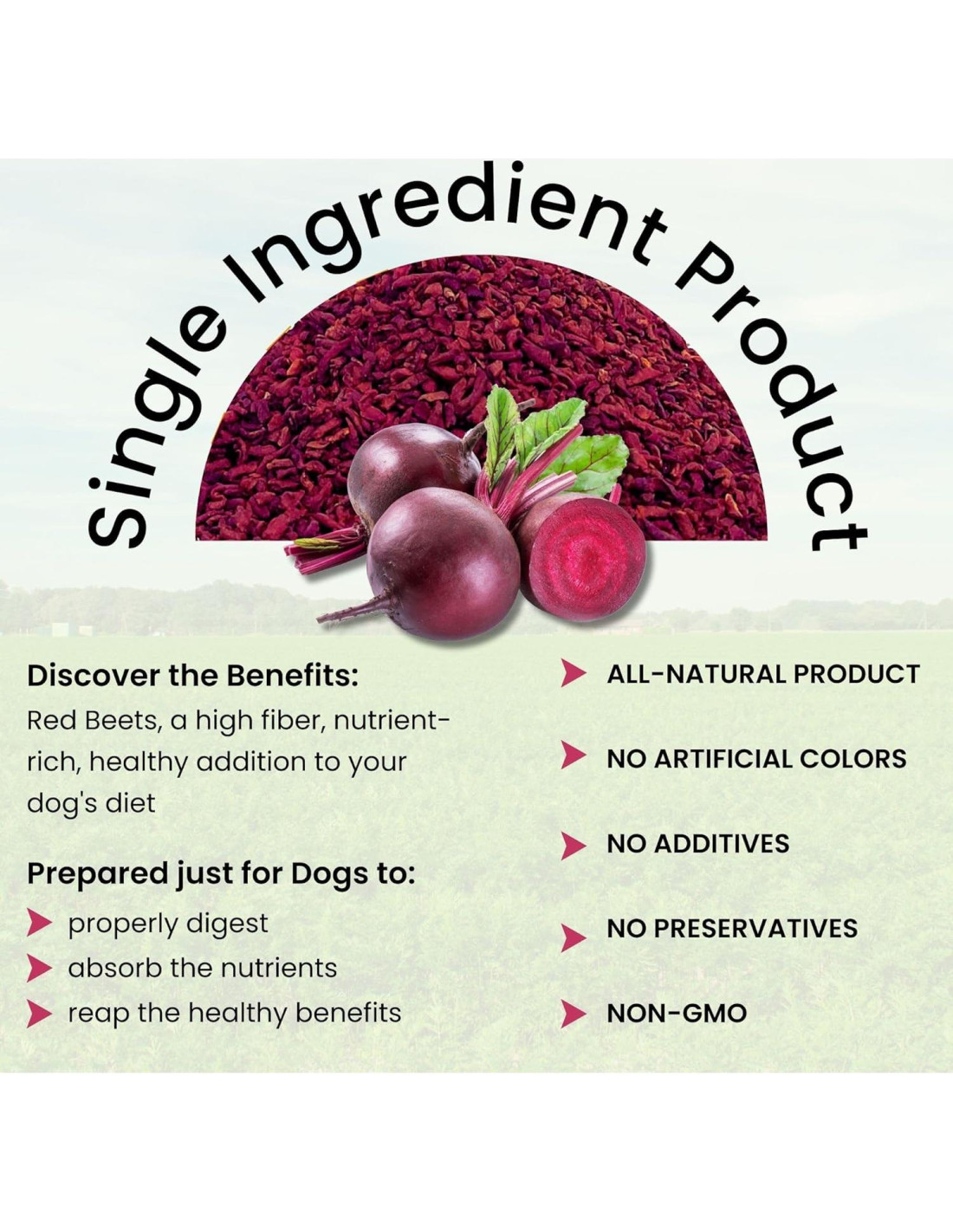 Las remolachas rojas no son comúnmente alimentadas a los perros como golosinas y no son bien conocidas como un ingrediente en alimentos para mascotas. No te equivoques, esto no es pulpa de remolacha, un subproducto de la industria azucarera comercial que a menudo se añade a los alimentos para perros como fuente de fibra para perros, pero ofrece casi ningún valor nutricional. Nuestras remolachas rojas están hechas de remolacha roja 100% no transgénica, también conocida como remolacha de mesa, que los humanos han valorado durante siglos por sus numerosos beneficios para la salud. Verdaderamente un superalimento, las remolachas rojas tienen un impresionante perfil nutricional que rara vez se encuentra en cualquier otro alimento. Si bien los beneficios saludables son casi infinitos, las Remolachas Rojas Olewo son mejor conocidas como un suavizante natural para la piel de los perros para problemas comunes de piel y picazón que ocurren por deficiencias nutricionales o necesidad de limpieza.