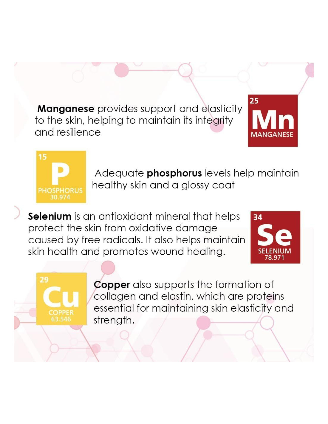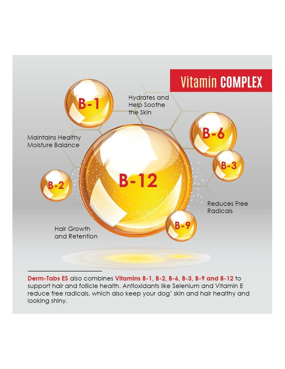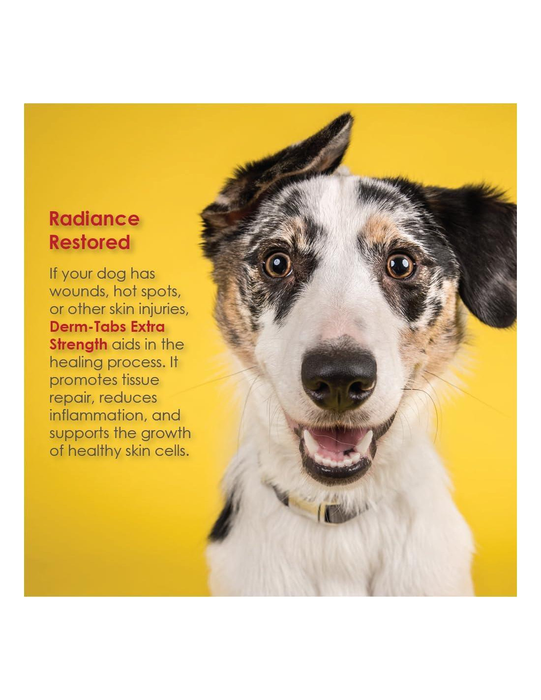 - Derm-Tabs está hecho con una mezcla de vitaminas, minerales y antioxidantes para apoyar la piel y el pelaje.