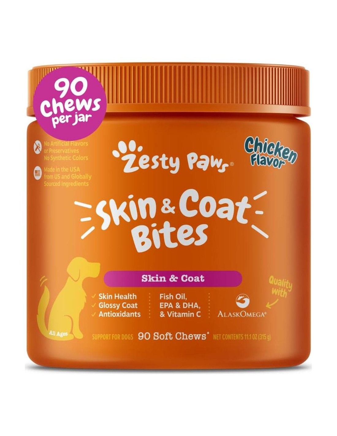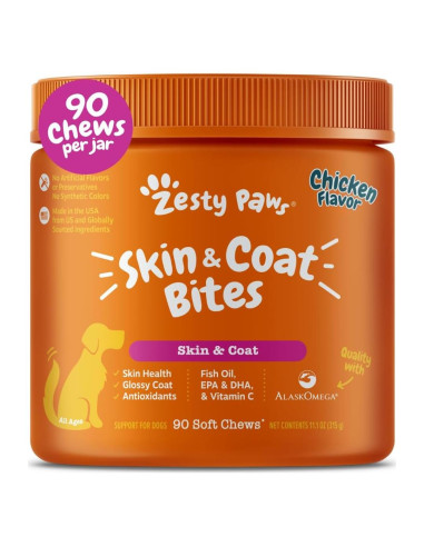 - Rico Soporte Omega-3 - Los Bocados Omega de Zesty Paws son deliciosas golosinas masticables con ácidos grasos Omega (con EPA y DHA), vitaminas y nutrientes para ayudar a los perros a verse y sentirse lo mejor posible.