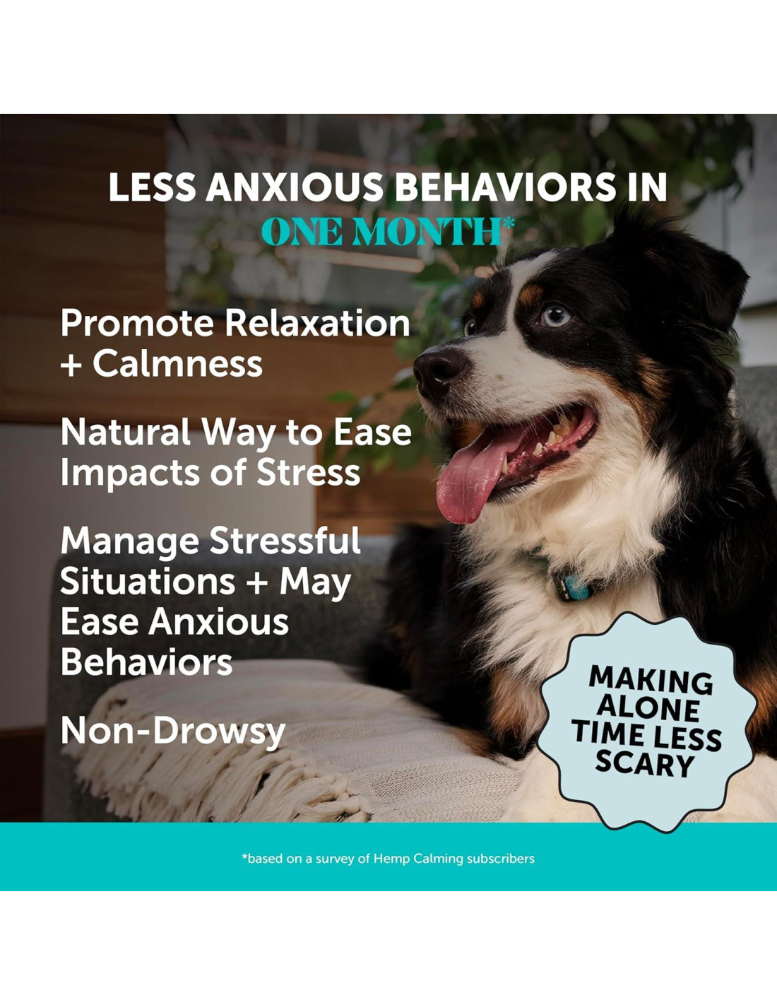 - CALMA, FRÍO Y COLECTIVO: Nuestros masticables relajantes para perros están hechos de ingredientes naturales que ayudan a que el estrés y la preocupación se desvanezcan. De hecho, el 80% notó una mejora en el comportamiento ansioso o el estrés de su perro en un mes. * Basado en una encuesta de suscriptores de Cáñamo Calmante.