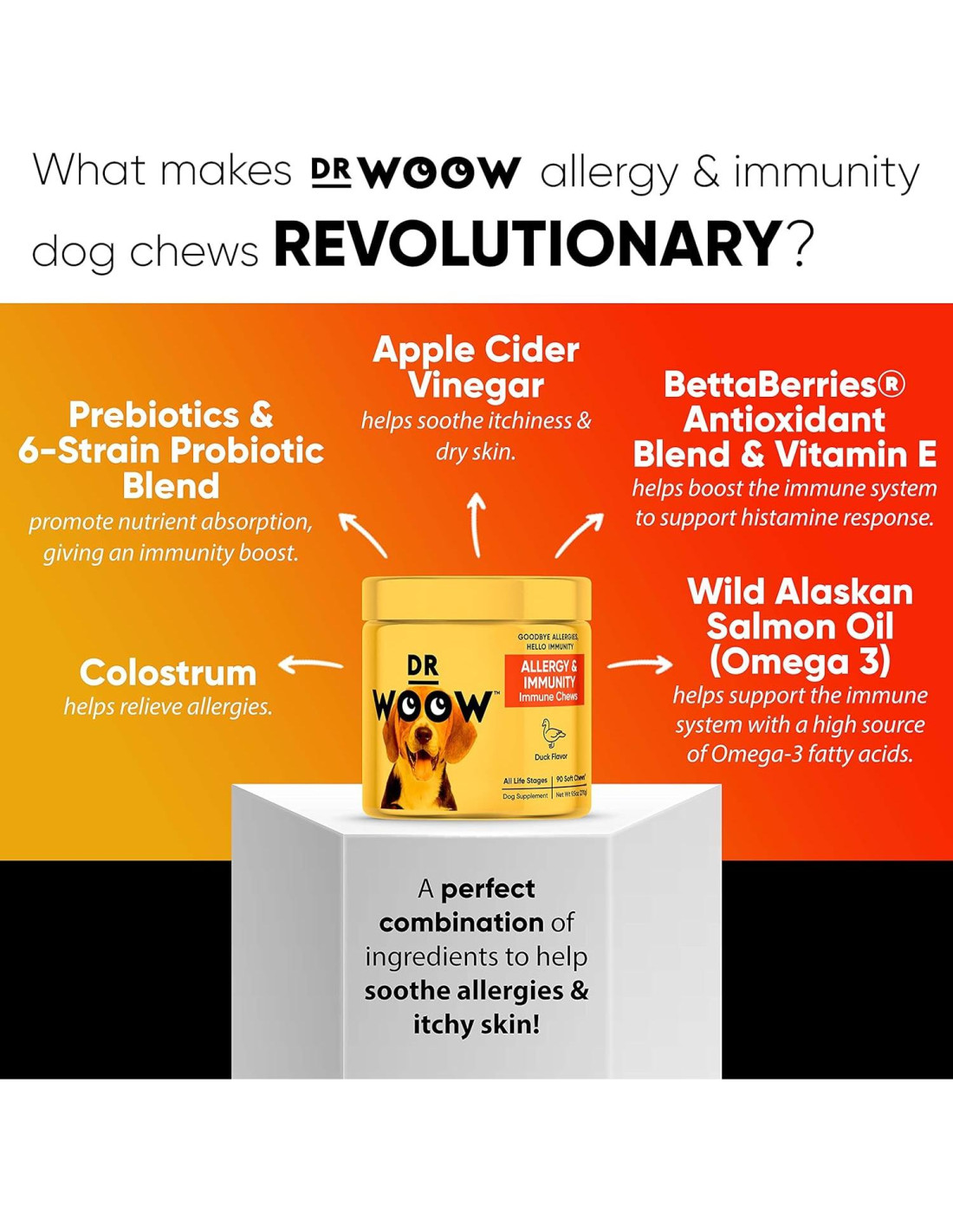 El equipo de nutricionistas de Dr Woow creó cuidadosamente los bocados para alergias de perros de Dr Woow para ayudar a los perros a vivir sus mejores vidas. Estos suplementos inmunológicos para perros son una combinación perfecta de ingredientes para potenciar el sistema inmunológico. Si estás buscando inmunidad contra alergias para perros, ¡no busques más!