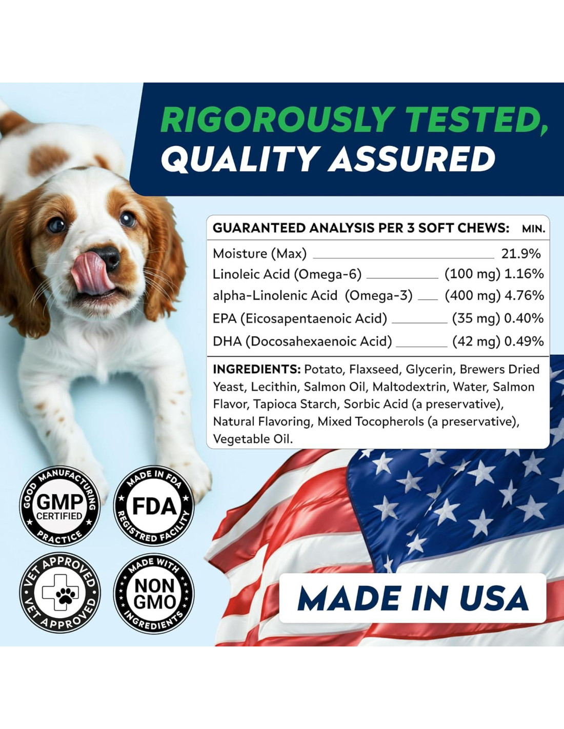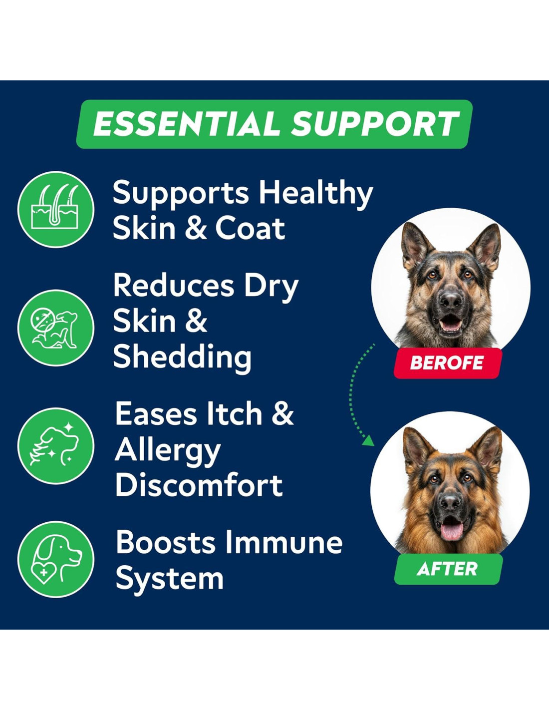 - Alivio de Picazón en Perros, Suplemento para la Piel y el Pelaje - con alto contenido de ácidos grasos Omega (a 500mg por porción), estas golosinas anti-picazón ayudan a su mascota con piel seca y puntos calientes, reducen la picazón, la piel irritada, sensible y escamosa, detienen la caída, promueven un pelaje saludable, suave y brillante y el crecimiento del cabello.