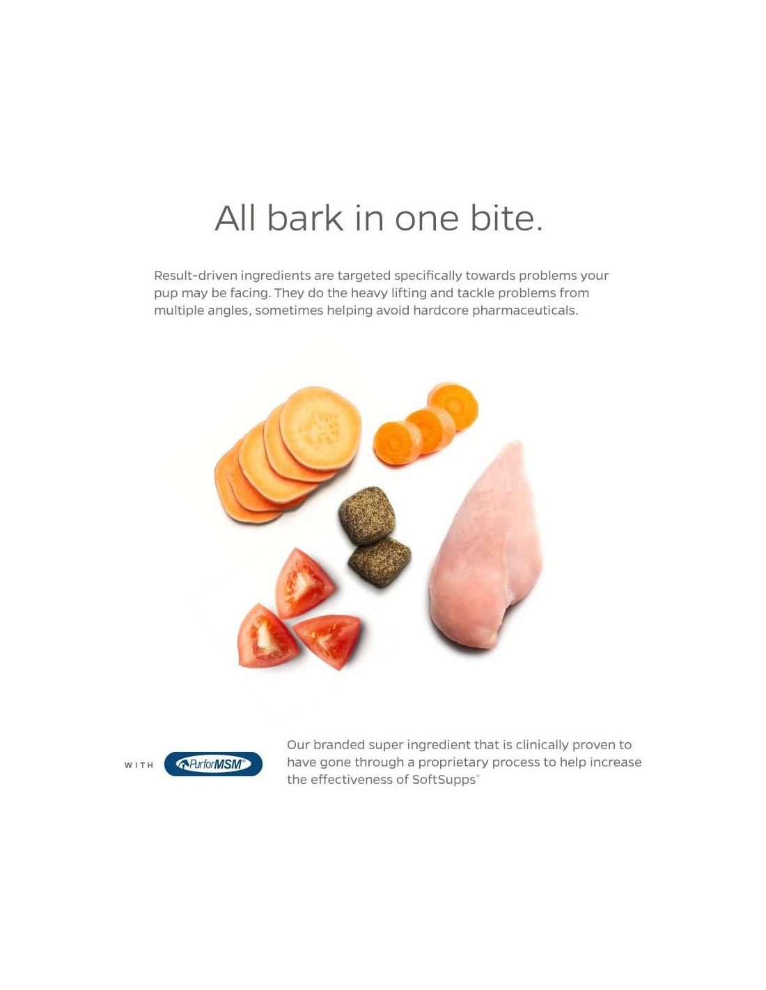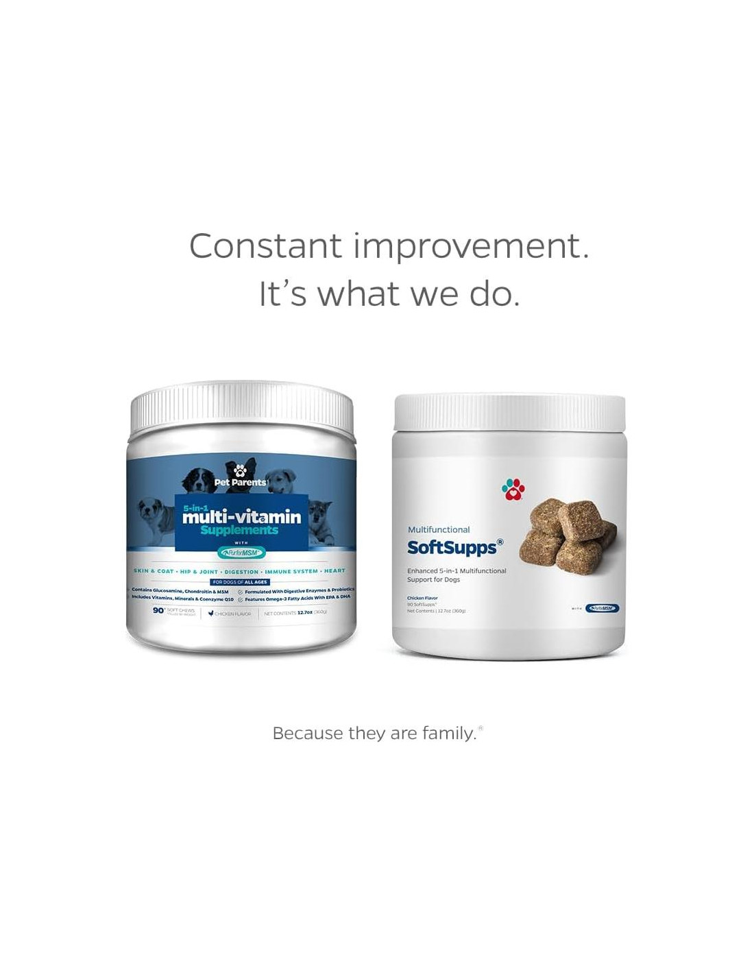 - SIN RELLENOS + INGREDIENTES DE MARCA: Las multivitaminas para perros de Pet Parents están hechas con carnes y verduras enteras, no con arroz y avena. Además de nuestros ingredientes activos premium, nuestros otros ingredientes inactivos también están cargados de nutrientes: pollo, batatas, tomates y zanahorias. Usamos el ingrediente de marca clínicamente probado, PurforMSM, que pasa por un proceso patentado que aumenta su eficacia y es más efectivo que el MSM básico para perros que se encuentra en la mayoría de otros suplementos.