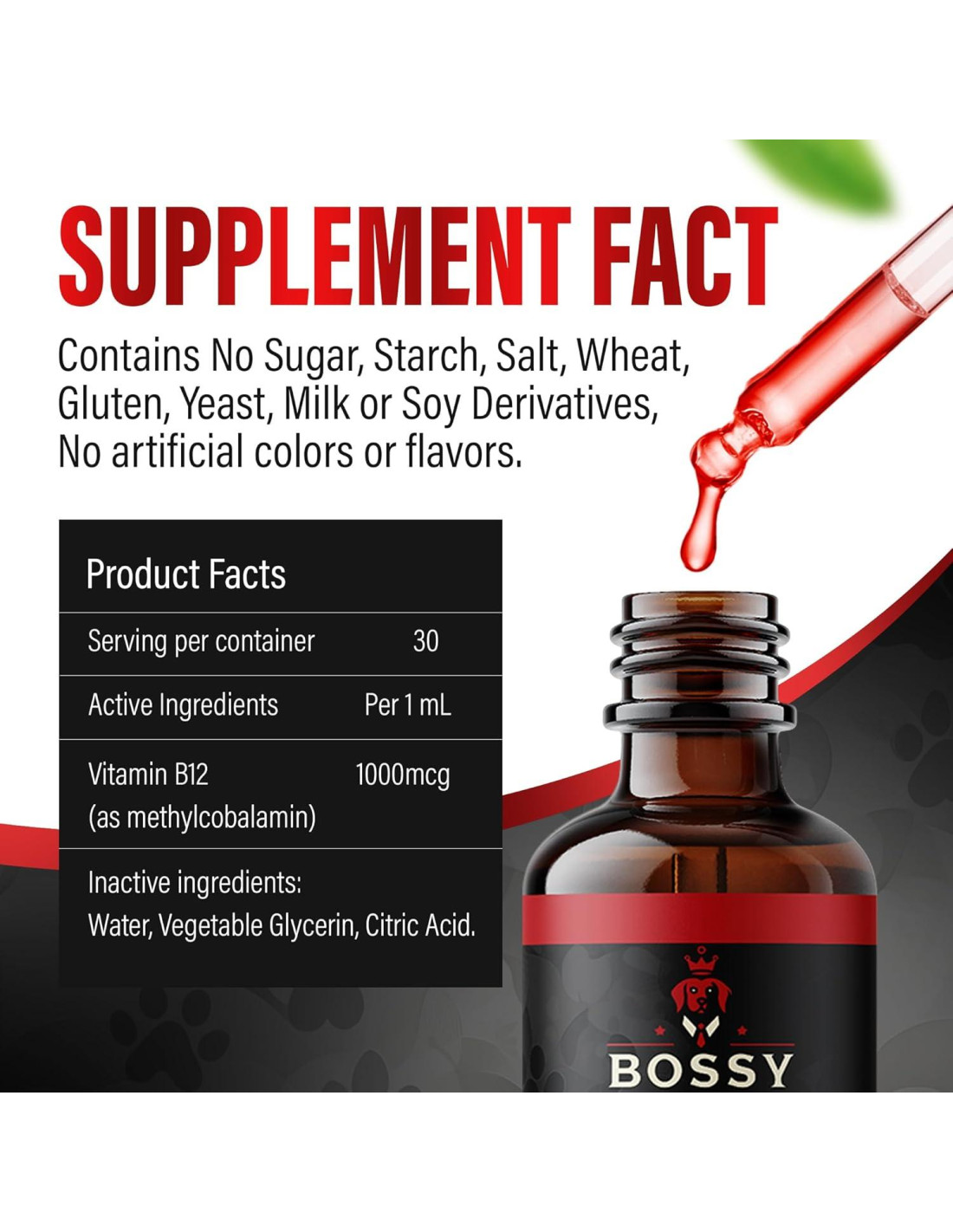 En Bossy Pet, el amor no es solo nuestra inspiración, es nuestra base. Desde 2023, hemos sido impulsados por el profundo vínculo que compartimos con nuestras propias mascotas creando suplementos que reflejan el mismo cuidado, confianza y devoción que nos brindan cada día. Lanzamos nuestra fórmula de B12 después de ver a nuestras mascotas luchar con la pérdida de energía, bajo apetito y desequilibrio emocional. Por eso creamos una solución inspirada en el amor y respaldada por la ciencia. A diferencia de las pastillas o golosinas, especialmente para mascotas exigentes o mayores. El líquido (B12) entra al torrente sanguíneo más rápidamente, proporcionando resultados más rápidos en energía, apetito y estado de ánimo. Simplemente déjalo caer en la boca de tu mascota, comida o agua, sin pastillas que esconder, triturar o pelear. Personaliza la cantidad gota a gota según el peso, edad o necesidades de tu mascota. A medida que las mascotas envejecen o enfrentan estrés, enfermedad o deficiencias dietéticas, pueden sufrir de: Muchos padres de mascotas luchan por encontrar un suplemento que no solo sea efectivo, sino también fácil de administrar, especialmente a los comedores exigentes o mascotas mayores. El B12 de Bossy Pet es más que un suplemento, es una solución de grado clínico diseñada para resultados reales en perros y gatos. Metilcobalamina: La forma de B12 más biodisponible y neurológicamente activa. Fórmula Líquida: Absorción más rápida, más fácil de dar, ideal para mascotas sensibles. Alta Potencia y Dosis Precisa: 1000mcg/mL, personalizable gota a gota. Fabricado en Laboratorios Certificados en EE. UU.: Calidad GMP para seguridad y pureza. Solo Ingredientes Limpios: Sin azúcar, gluten ni aditivos artificiales. Adaptado para apoyo en energía, apetito y sistema nervioso sin compromisos.