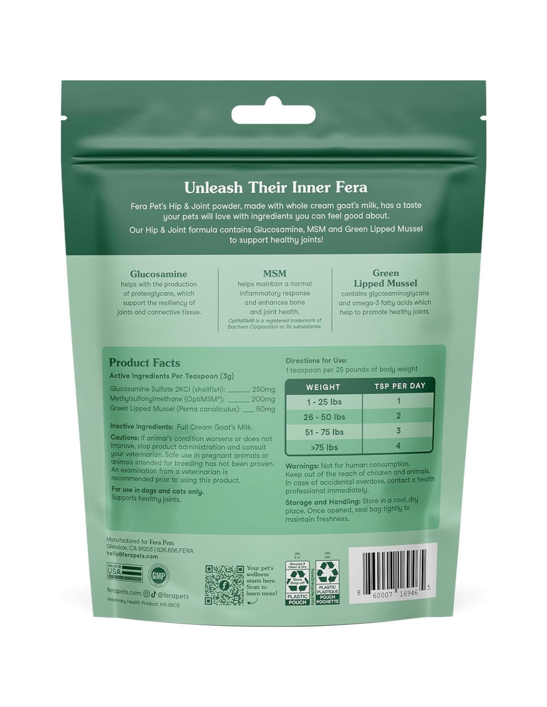 - Suplemento para articulaciones de gatos y perros: La leche de cabra de Fera para caderas y articulaciones contiene glucosamina para gatos y perros, además de otros ingredientes poderosos para ayudar a mantener las articulaciones y tejidos conectivos de las mascotas; especialmente útil para mascotas con problemas de caderas o columna
