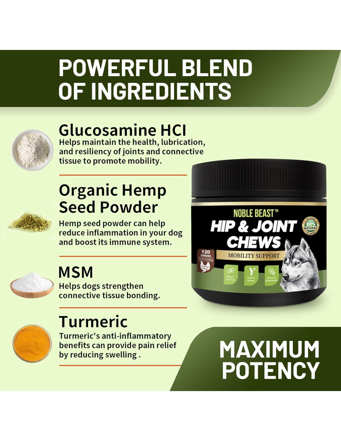 - INGREDIENTES Y FÓRMULA PREMIUM: Los masticables de Soporte de Movilidad están cargados con ingredientes de alta calidad que apoyan la salud y generan confianza, ofreciendo cuidado proactivo de caderas y articulaciones y ayudando a perros que ya enfrentan problemas articulares. La combinación de Glucosamina, Condroitina y MSM trabaja en conjunto para aliviar la incomodidad articular y mejorar la función y flexibilidad articular. Nuestra fórmula contiene Aceite de Cáñamo Orgánico y Polvo de Semilla de Cáñamo Orgánico para reparar y fortalecer los tejidos blandos y las articulaciones.