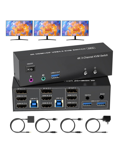 - [Conmutador KVM 3 Monitores 2 Computadoras] El conmutador KVM de 3 monitores con 2*HDMI y Displayport está diseñado principalmente para compartir 3 monitores (2 HDMI y 1 DP) y 3 dispositivos USB 3.0 entre 2 computadoras, fácil cambio, conectar y usar, lo que lo convierte en una solución ideal para oficinas en casa, aulas multimedia, salas de reuniones de negocios y configuraciones de juegos. Soporta cambio flexible entre modo extendido (mostrando contenido diferente en pantallas duales) y modo espejo (duplicando contenido idéntico). Nota: este es un conmutador KVM de 1 Displayport+2 HDMI, por favor asegúrese de que cada PC tenga 1 DP+2 puertos HDMI para obtener 3 pantallas externas