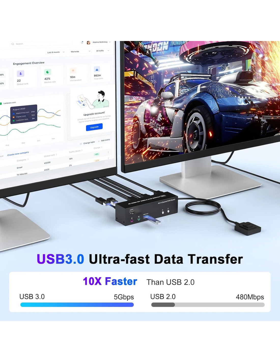 - [3*USB 3.0 + Jack de Audio] Este conmutador KVM de 2 computadoras y 3 monitores cuenta con tres puertos USB 3.0 de alta velocidad, un jack dedicado para micrófono/auriculares. Conecte fácilmente periféricos como discos duros externos, impresoras, micrófonos y auriculares, eliminando el desorden de adaptadores para un espacio de trabajo más ordenado y productivo