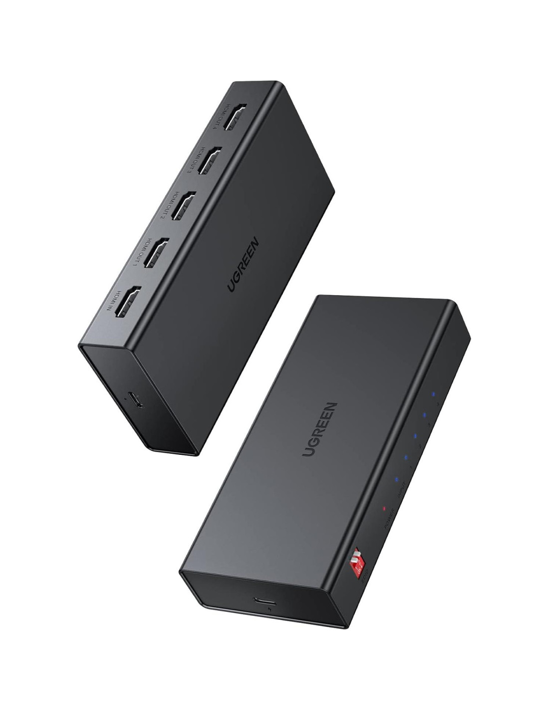 - Una Fuente, Múltiples monitores: Si tienes una fuente y deseas enviar la señal de la fuente a múltiples televisores en diferentes habitaciones, o en la misma habitación, el divisor HDMI 1 en 4 de UGREEN está diseñado para ti. Puede duplicar 1 señal de entrada HDMI a 4 pantallas HDMI diferentes, y transmitir audio y video simultáneamente.