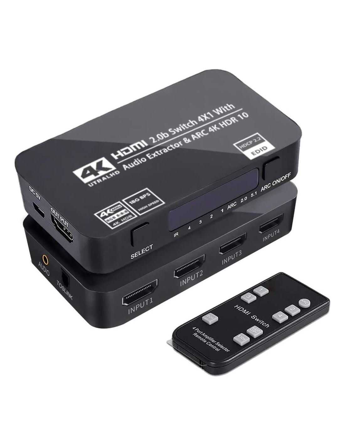 - Conmutador HDMI 4 en 1: Este conmutador HDMI admite HDR (formato YUV 4:2:0) color profundo de 12 bits, HDCP1.4, HDMI 2.0 (YUV 4:2:0), puede seleccionar fácilmente 4 fuentes HDMI que escalan hasta 4K@60Hz a una única salida HDMI que deseas. El conmutador HDMI admite color profundo de 12 bits por canal (48 bits en todos los canales), admite función ARC. La salida HDMI se puede seleccionar mediante un botón local o un control remoto inalámbrico IR.