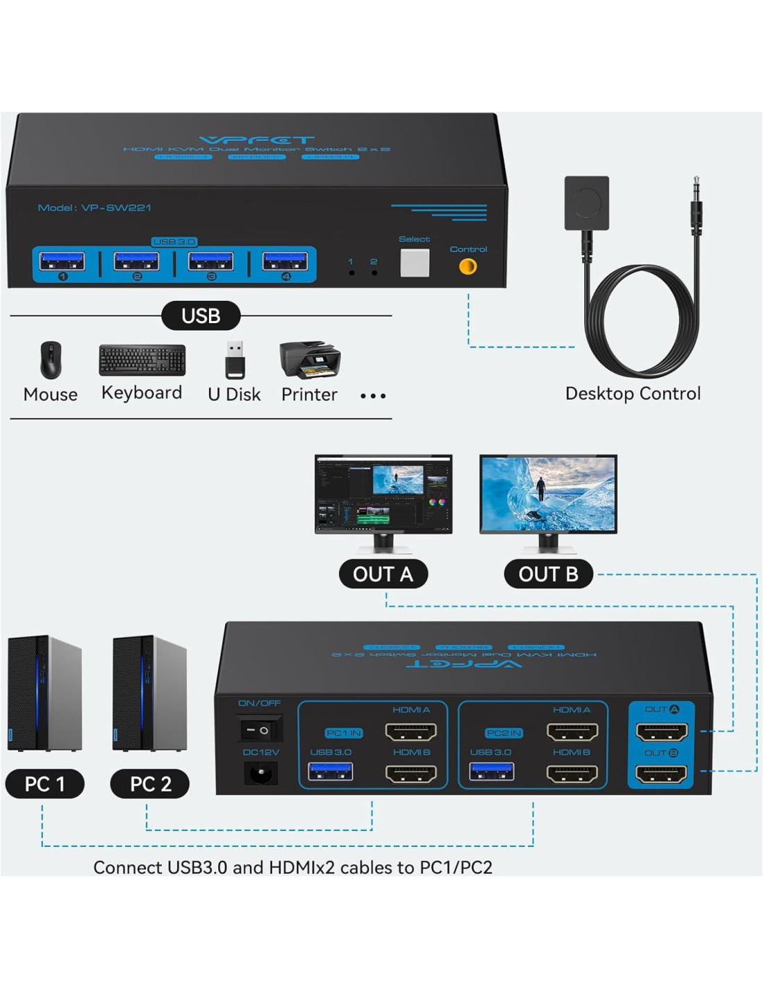 - Interruptor KVM de Doble Monitor: Este interruptor KVM de doble pantalla le permite usar un conjunto de teclado y ratón para controlar 2 computadoras, compartir 4 dispositivos USB y 2 monitores y soportar modo de copia y modo de extensión (requiere que su computadora tenga 2 puertos HDMI) modo de copia: dos monitores emiten la misma imagen, modo de extensión: dos monitores emiten imágenes diferentes