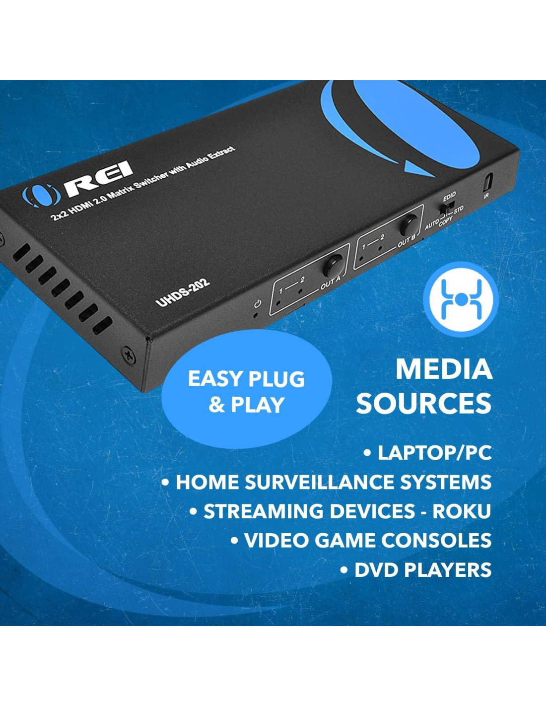 - OREI 2 EN 2 SALIDA INTERRUPTOR HDMI - Gestión inteligente de EDID, 4K/60Hz 4:4:4, interruptor 4x1 18G con audio descompuesto, HDR, HDCP 2.2. Este interruptor HDMI está diseñado con 2 puertos de entrada y 2 puertos de salida, puede elegir la fuente de señal HDMI mediante el control remoto IR, fácil de acceder.