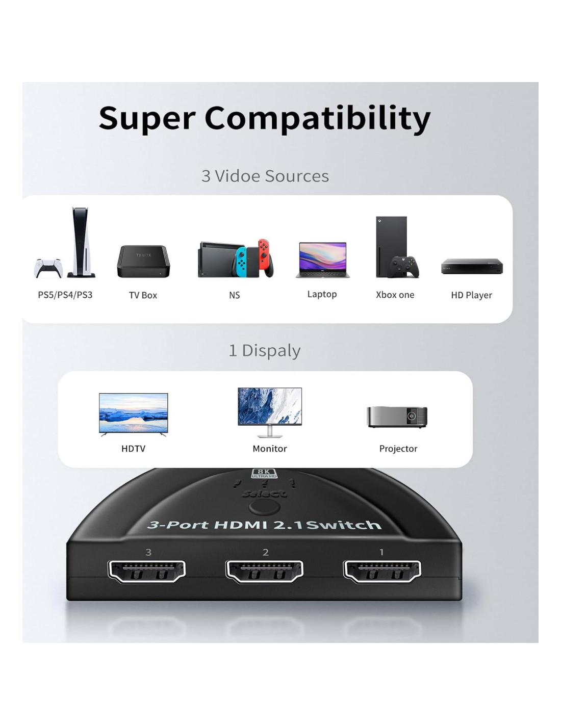 - [Soporte de Ultra-Alta Resolución 8K]: Este interruptor HDMI de 3 puertos soporta impresionantes resoluciones de hasta 8K@60Hz con Ultra Full HDR y capacidades de visualización 3D. Es completamente compatible con HDMI 2.1, HDCP 2.3, y estándares HDMI anteriores. Disfruta de una experiencia de visualización suave e inmersiva con tasas de refresco de 4K@60Hz, 4K@120Hz, y 1080P@240Hz, haciéndolo perfecto para juegos y contenido de alta definición.