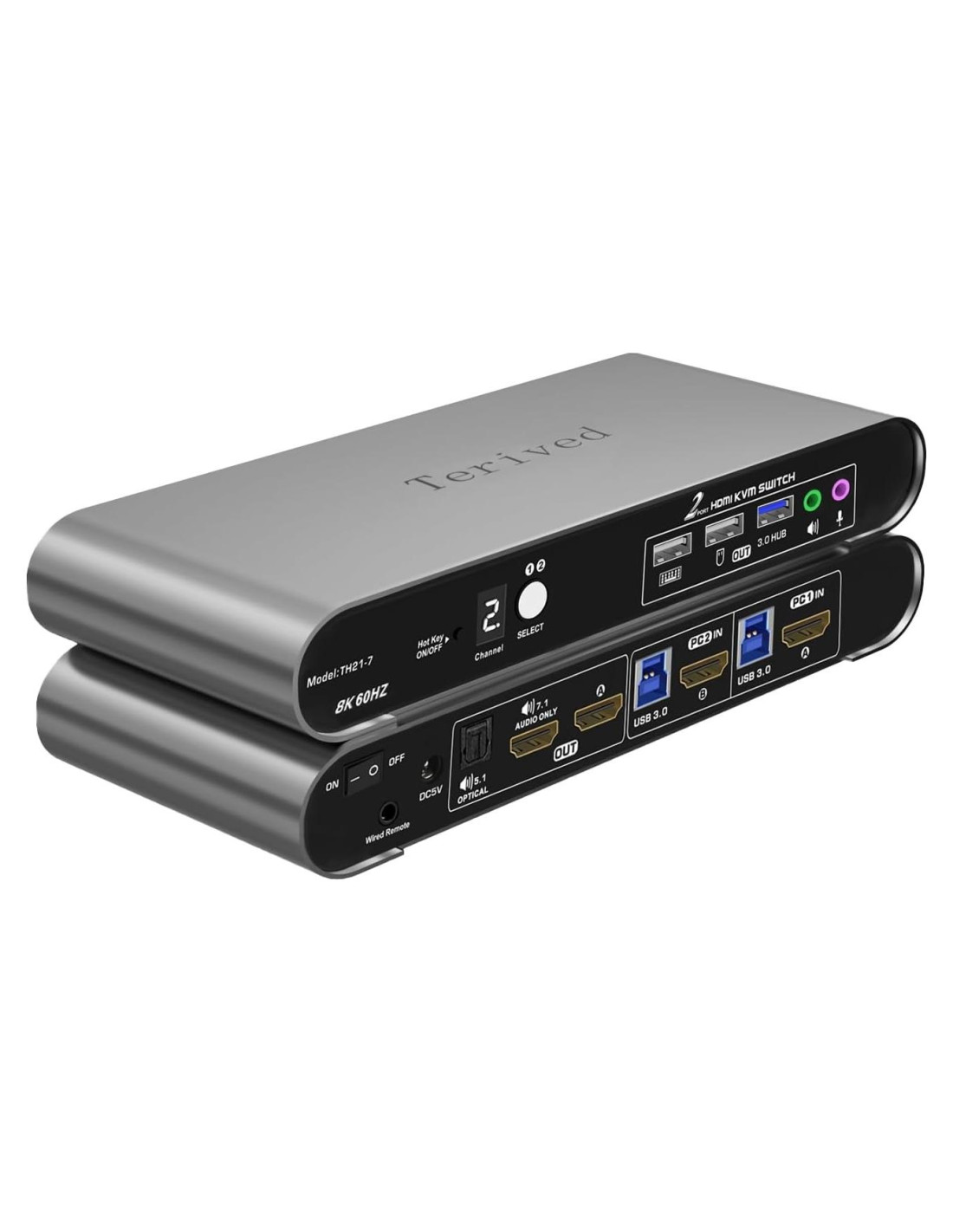 - 2 Computadoras 1 Monitor HDMI KVM 8K@60Hz - Controla 2 computadoras con interfaz HDMI u otros dispositivos aplicables utilizando un teclado, un ratón, un monitor con audio y micrófono, y un puerto HUB USB 3.0. Las opciones de conmutación versátiles incluyen conmutación por teclado, conmutación por ratón, control remoto por cable y conmutación manual por botón.