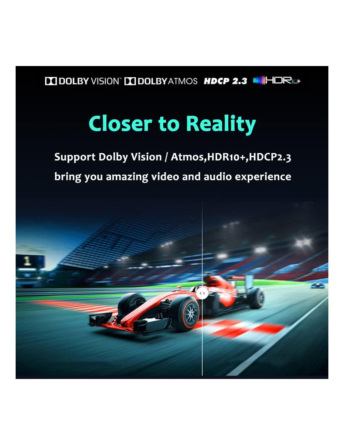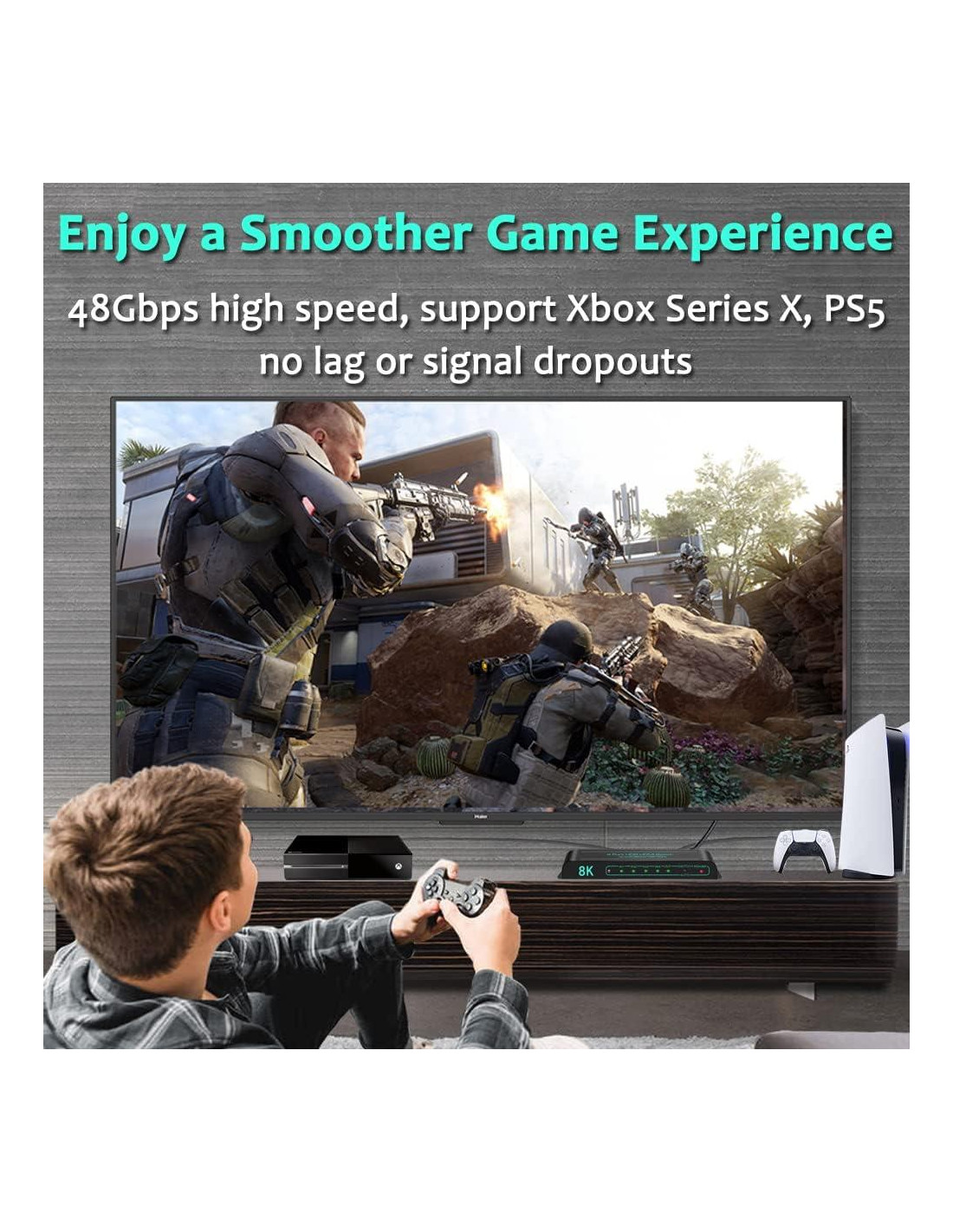 - [HDMI 2.1 genuino] El interruptor HDMI 2.1 soporta una velocidad de transferencia de 48Gbps, HDCP 2.3, HDR 10, HDR 10+, VRR, ALLM, Dolby Vision, Dolby Atmos; por favor use cables certificados HDMI 2.1 para obtener todas las características