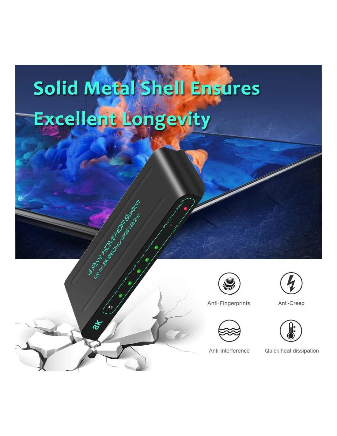 - [Interruptor HDMI 8K 4 en 1] Este interruptor HDMI de 4 puertos conecta 4 dispositivos HDMI a 1 TV HDMI y alterna entre ellos en segundos; le proporciona visuales inmersivos en 8K, sin retrasos ni caídas de señal