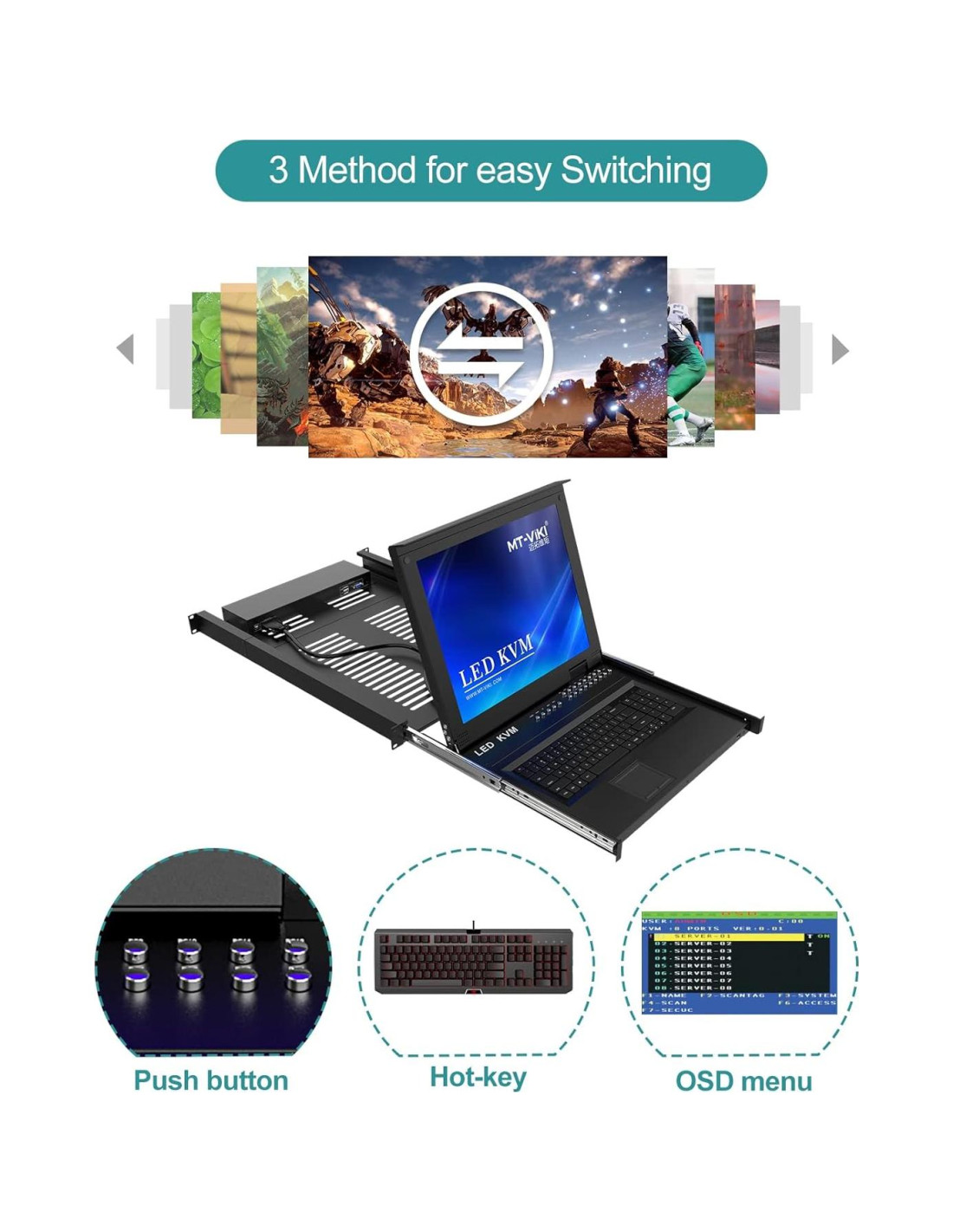 - MT-VIKI 1716UL, interruptor KVM VGA de 16 puertos con monitor LCD de 17 pulgadas, es la última versión para gestionar hasta 16 computadoras por 1 usuario.