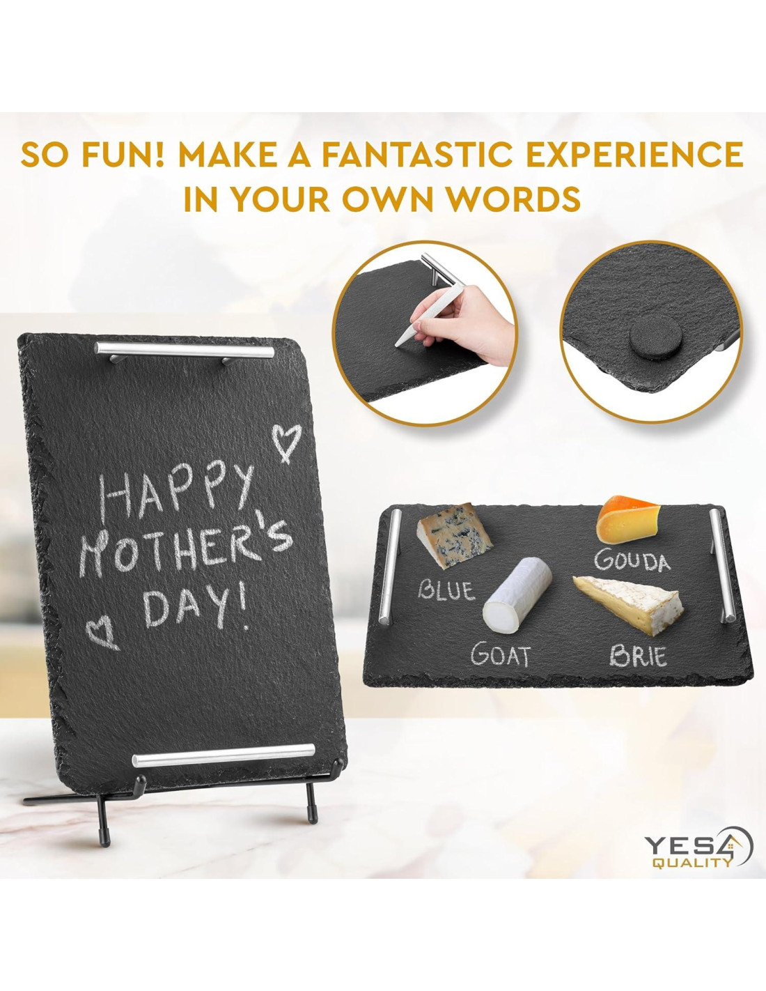 - TAMAÑO PERFECTO - Gran bandeja de pizarra (35.56 cm x 25.4 cm) perfecta para exhibir una variedad de deliciosos manjares, incluyendo carnes y quesos de diversas texturas; Ideal para dueños de restaurantes y chefs caseros que aspiran a presentar sus platos con estilo; Los mangos de acero inoxidable permiten una comodidad de transporte óptima