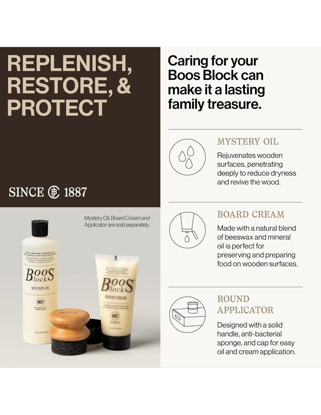 - Fácil Cuidado: Solo lavar a mano. Usa nuestro Aceite Misterioso Boos y Crema para Tabla (vendidos por separado) para preservar la belleza natural de la superficie y fibras de la tabla de madera. Consulta nuestra guía de cuidado para más detalles.