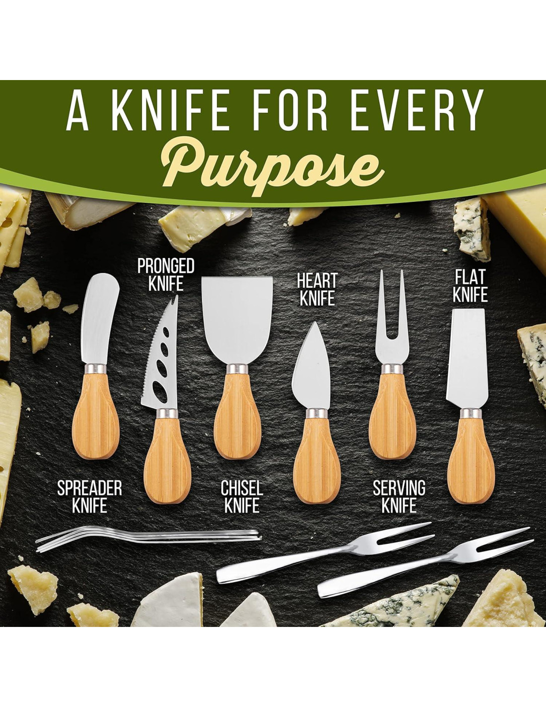 - SEIS CUCHILLOS DE QUESO INCLUIDOS: Este conjunto premium de tabla de queso de bambú incluye seis cuchillos de queso para que elijas, con 1 cuchillo para untar, 1 cuchillo con tenedor, 1 cuchillo cincel, 1 cuchillo en forma de corazón, 1 cuchillo para servir y 1 cuchillo plano para satisfacer tus necesidades