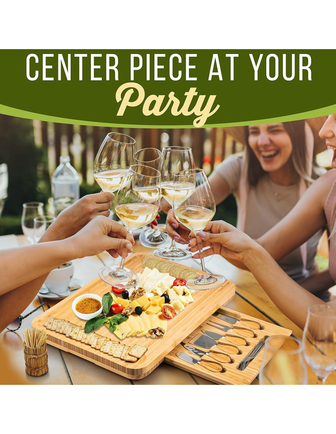 - Nombre del producto: Conjunto de Tabla de Queso de Bambú con Taza de Condimento de Bonificación - Tamaño Extra Grande 100% Placa de Madera Orgánica para el Hogar y Bandeja de Charcutería con 4 piezas de cuchillo cortador