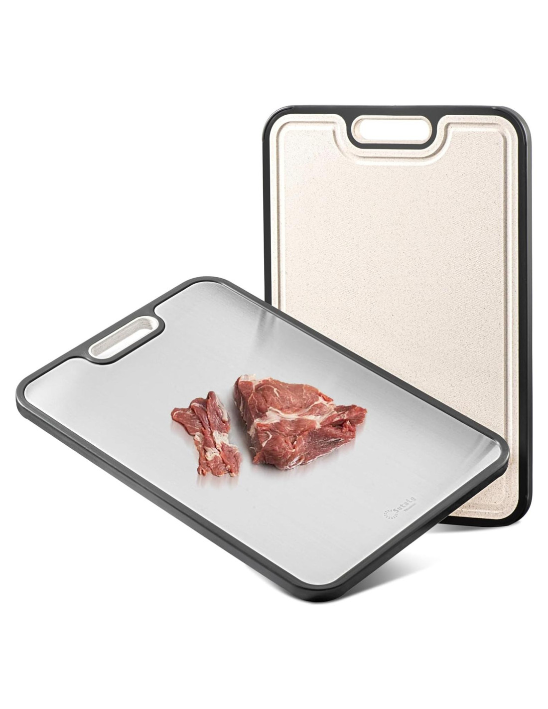- Tabla de Cortar 2 en 1: Esta gran tabla de cortar para carne en la cocina está hecha de titanio GR1 (para carne) y PP de paja de trigo (para verduras y frutas), lo que la hace resistente y duradera para su uso en la cocina (Nota: Las tablas de cortar de titanio se rayarán porque el acero es más duro que el titanio)