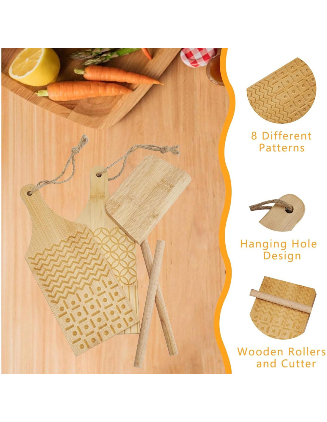 - [Diseño de Textura 4-en-1] Cada fabricante de pasta de madera está diseñado con 4 texturas de patrones tallados diferentes, el paquete incluye 2 paneles de gnocchi, puedes dar forma a 8 patrones diferentes de pasta para disfrutar de la diversión de hacer DIY con tu familia y amigos.